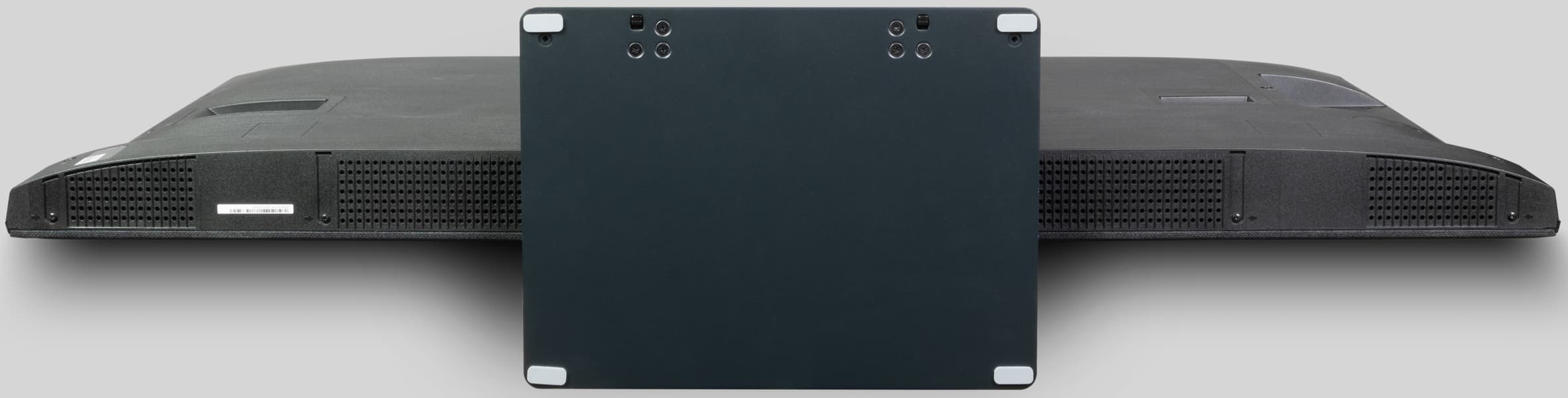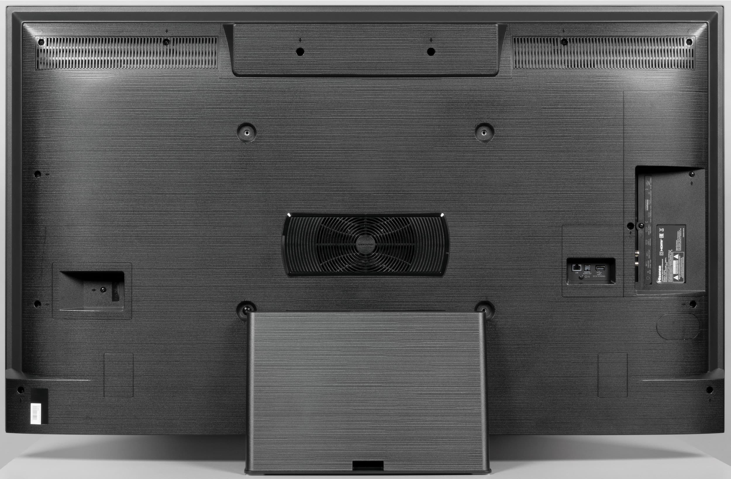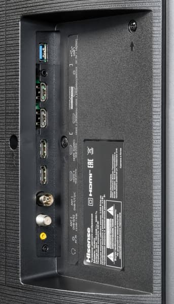 Сзади телевизор выглядит аккуратно. Задняя панель модуля матрицы изготовлена из штампованного листа стали, ее не прикрытые кожухом области имеют черное матовое покрытие. Эту особенность модели Hisense следует учитывать в момент сборки и перемещения телевизора: будьте аккуратны с краями, ведь вы будете держаться за сам модуль матрицы.