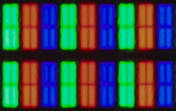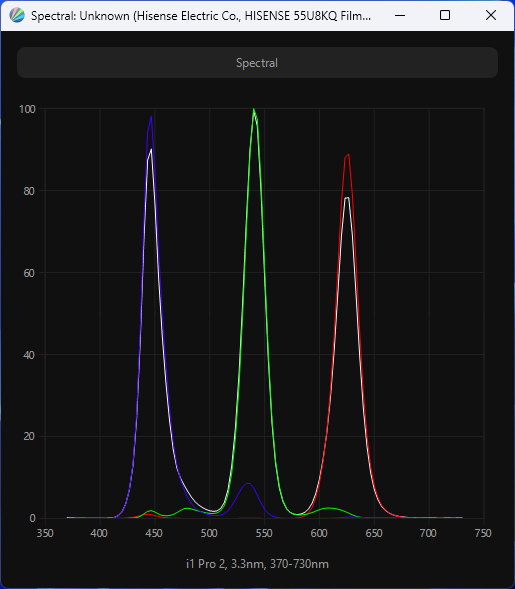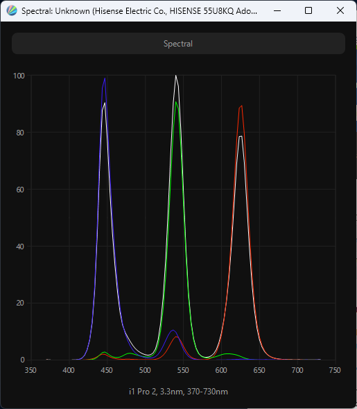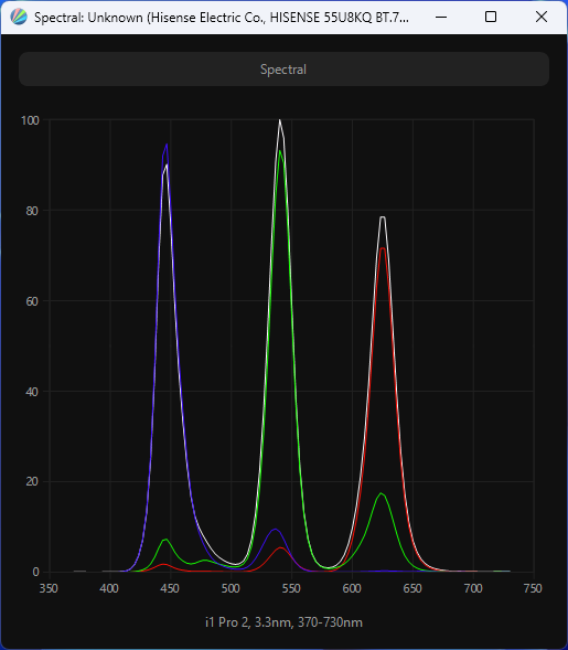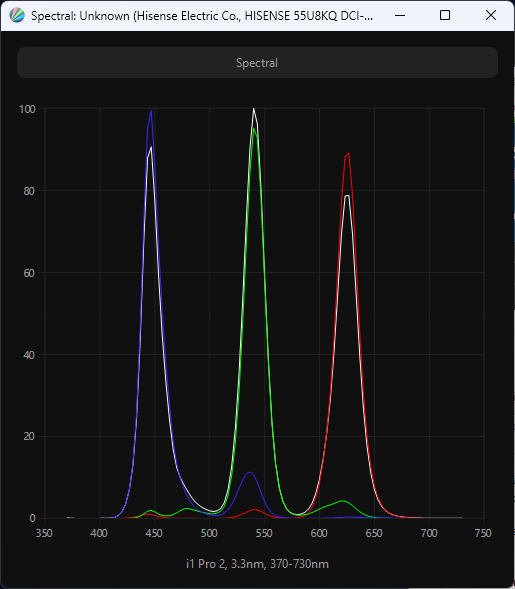 Видно, что спектры компонент хорошо разделены, что и позволяет получить относительно широкий цветовой охват. Перекрестное подмешивание незначительное, а узкие пики первичных цветов не противоречат заявлению производителя о том, что в подсветке используются «квантовые точки» (Quantum Dots).