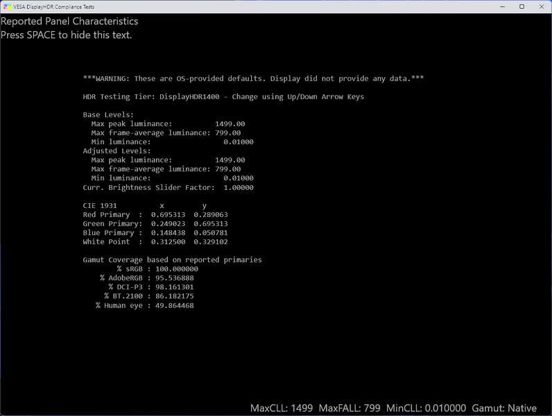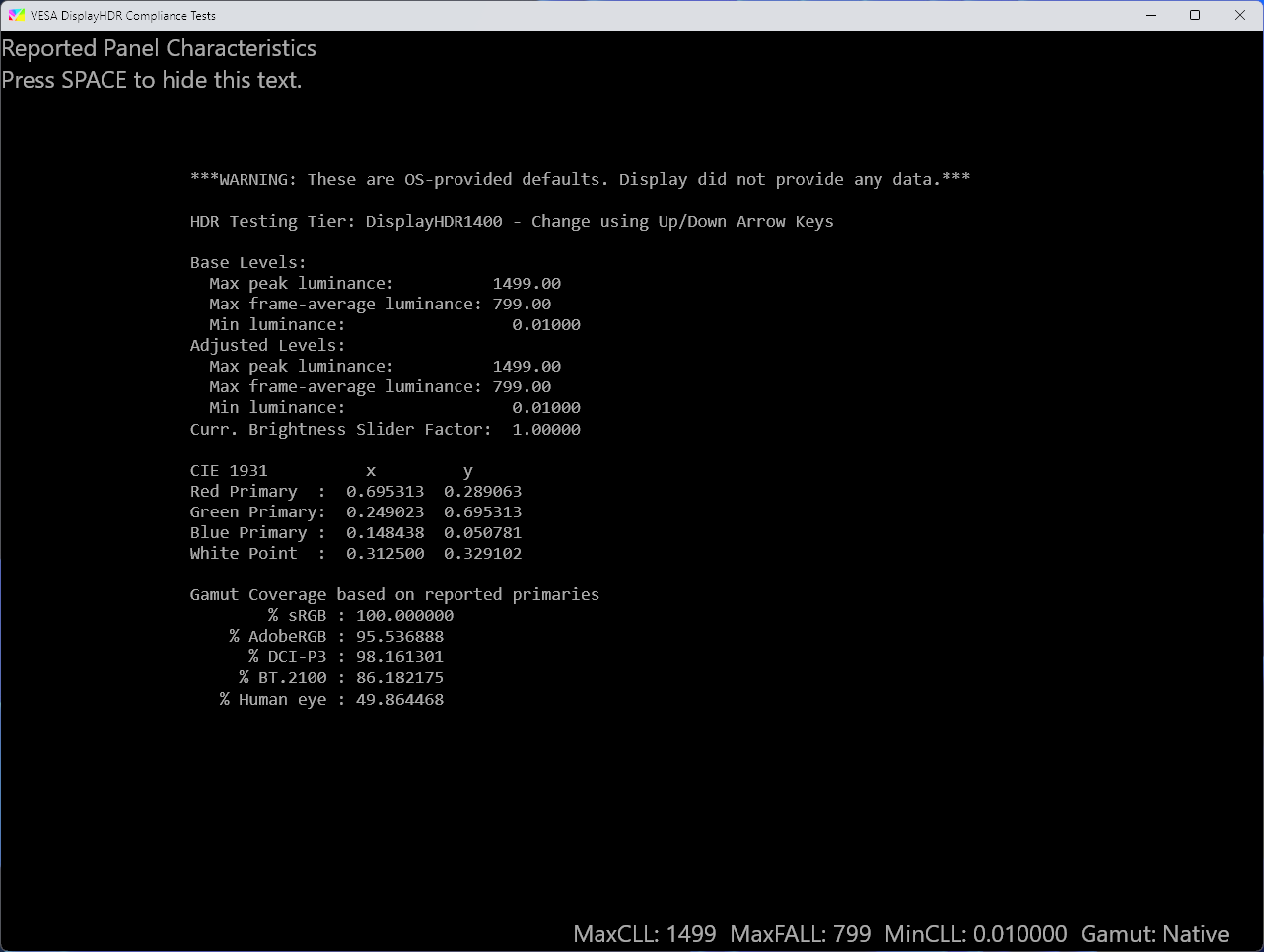 В режимах эмуляции трех основных цветовых пространств происходит соответствующее подмешивание компонент. Наиболее выраженное подмешивание наблюдается в режиме BT.709 на пике красного, уменьшается компонента зеленого для снижения цветовой насыщенности на соответствующих цветах. При этом цвета на экране в таком случае имеют естественную насыщенность, так как большинство изображений предполагают просмотр на устройствах с цветовым охватом, близким к sRGB/Rec.709/BT.709.