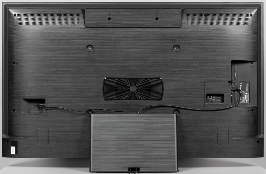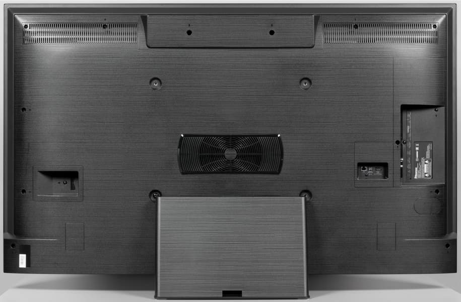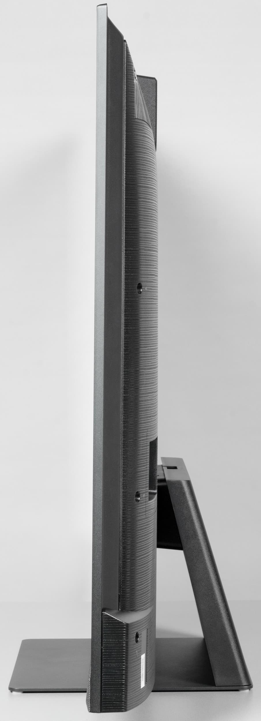 Несущая часть стойки изготовлена из алюминиевого сплава. Ее прикрывают кожухи из пластика с черной матовой поверхностью, местами с рельефным узором, как на заднем кожухе корпуса ТВ. Задний кожух стойки легко снимается без использования инструментов, и за ним можно комфортно пропустить все необходимые кабели, идущие от разъемов телевизора.