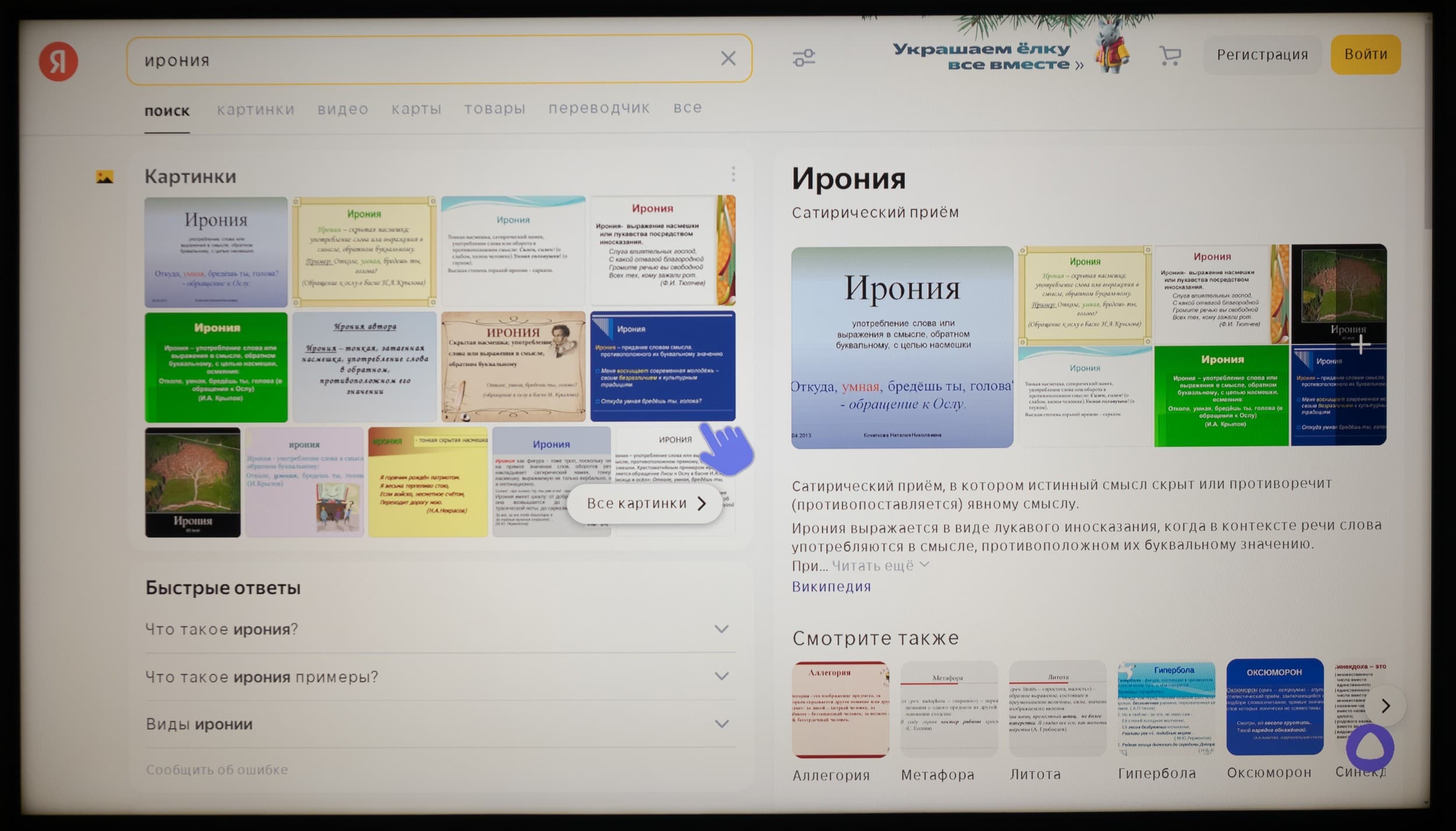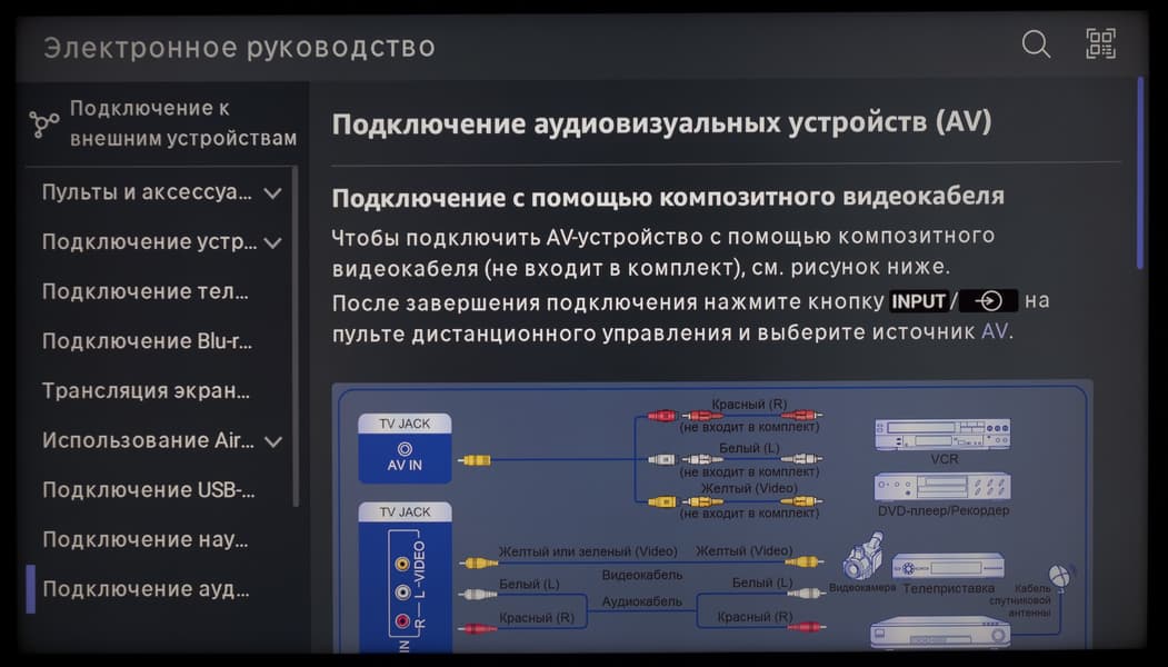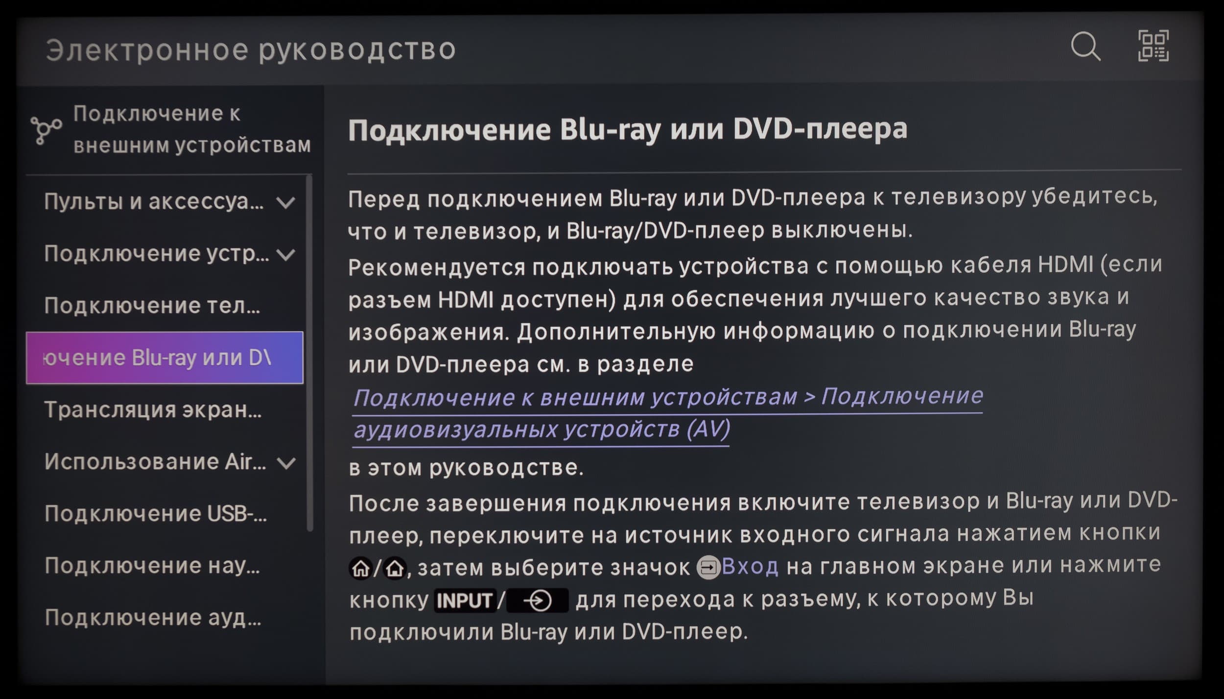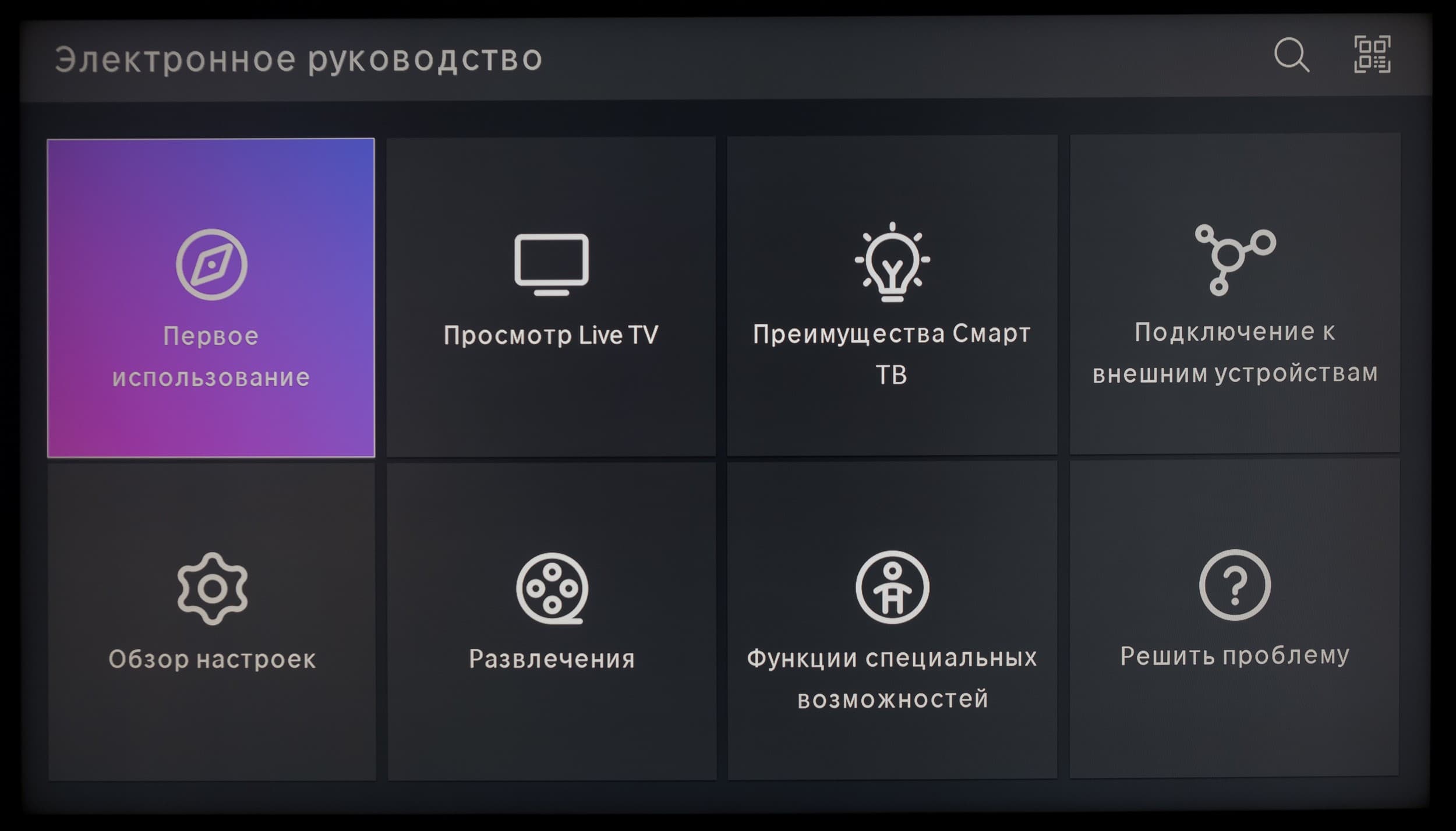 Бумажную инструкцию заменяет встроенное электронное руководство пользователя, в котором можно найти ответы на все основные вопросы, связанные с используемой операционной системой телевизора и его базовой функциональностью. Доступ к руководству пользователя можно получить через один из разделов основного меню либо через боковую панель домашней страницы ОС.