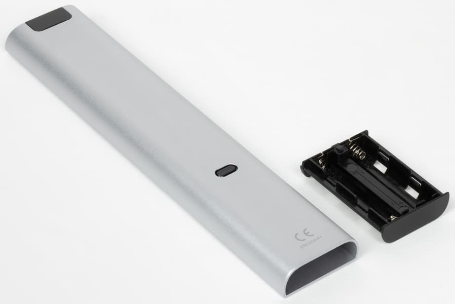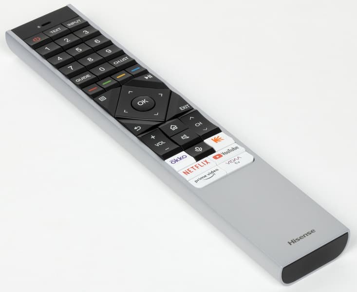 Для своей новой модели компания Hisense обновила облик пульта ДУ. Основная часть его корпуса изготовлена из литого алюминия с серой матовой поверхностью. Блок кнопок для быстрого перехода в предустановленные приложения (онлайн-платформы) был перенесен в нижнюю часть.