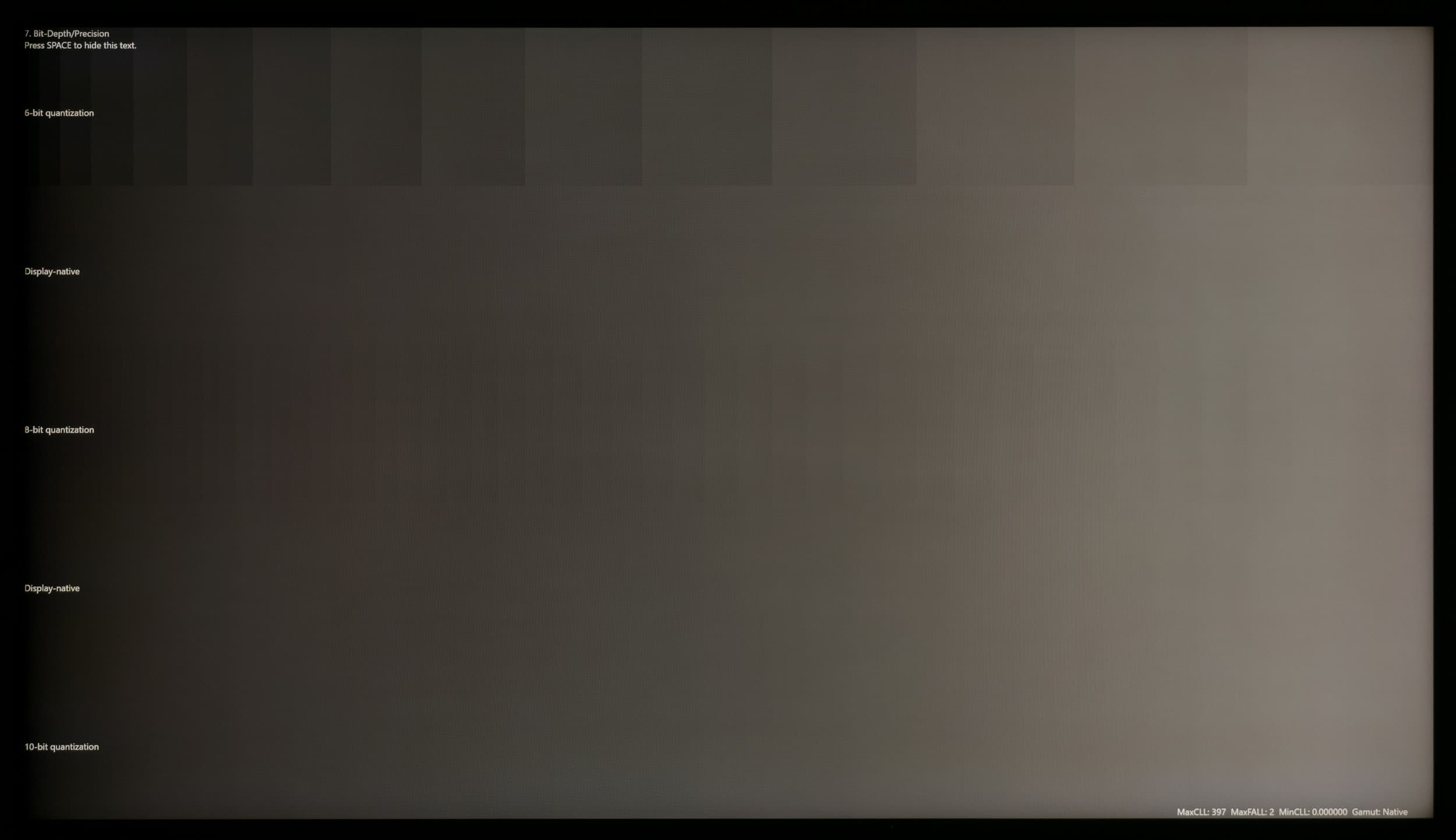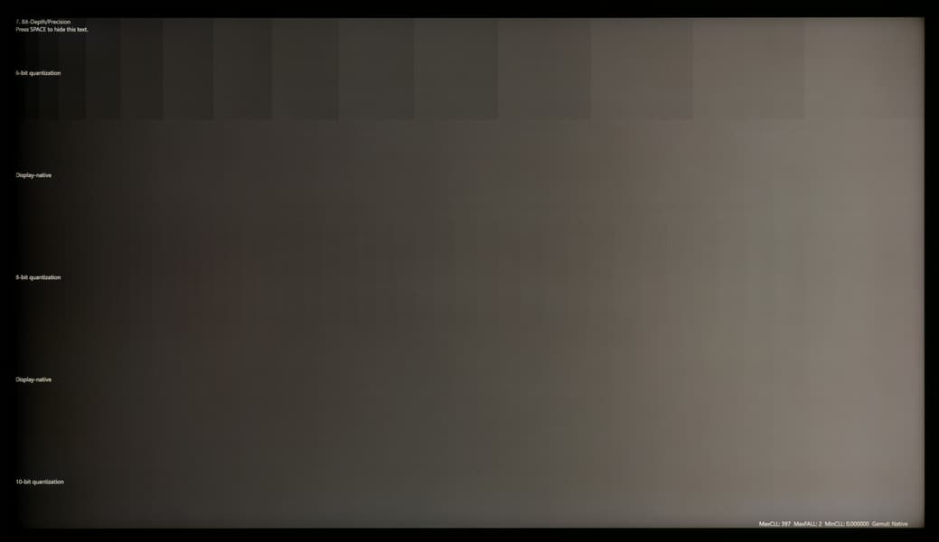 Наглядно видно, что телевизор способен выводить градиенты в 10-битном режиме более качественно, чем в стандартном 8-битном. Но в большей степени это будет актуально при выводе HDR-контента с соответствующими требованиями к ТВ.