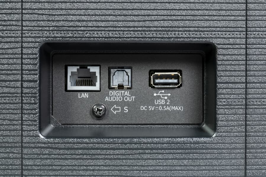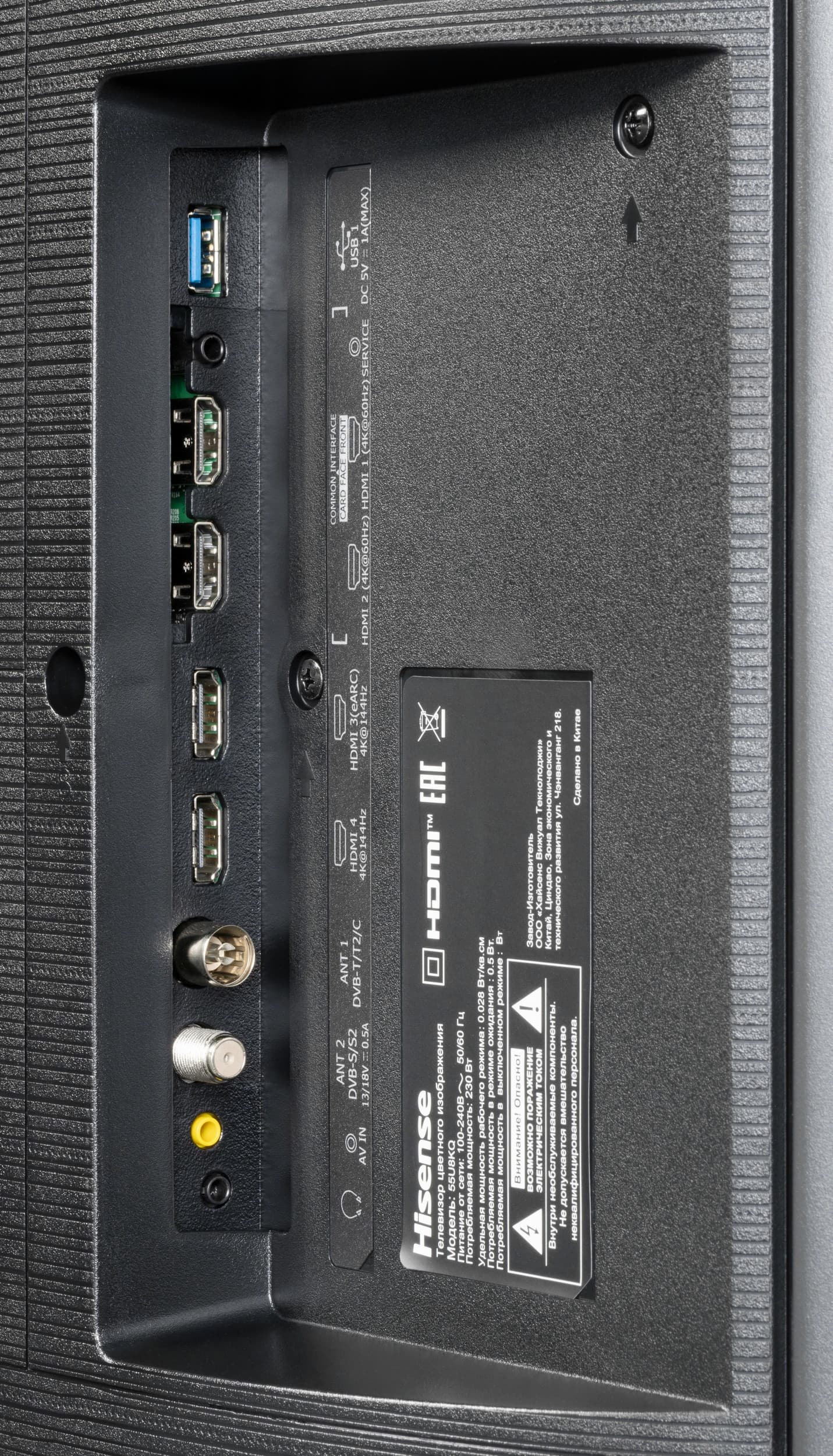 В плюсы телевизора стоит записать четыре входа HDMI (HDMI 1 и 2 — версии 2.0, а HDMI 3 и 4 — 2.1) и два USB, один из которых версии 3.0 с максимальным током до 1 А, что обеспечивает беспроблемность работы большинства не слишком требовательных к питанию внешних жестких дисков (HDD) и твердотельных накопителей (SSD). К другому входу USB версии 2.0 можно подключать слаботочную периферию, с требованиями по питанию не выше 5 В и 0,5 A.