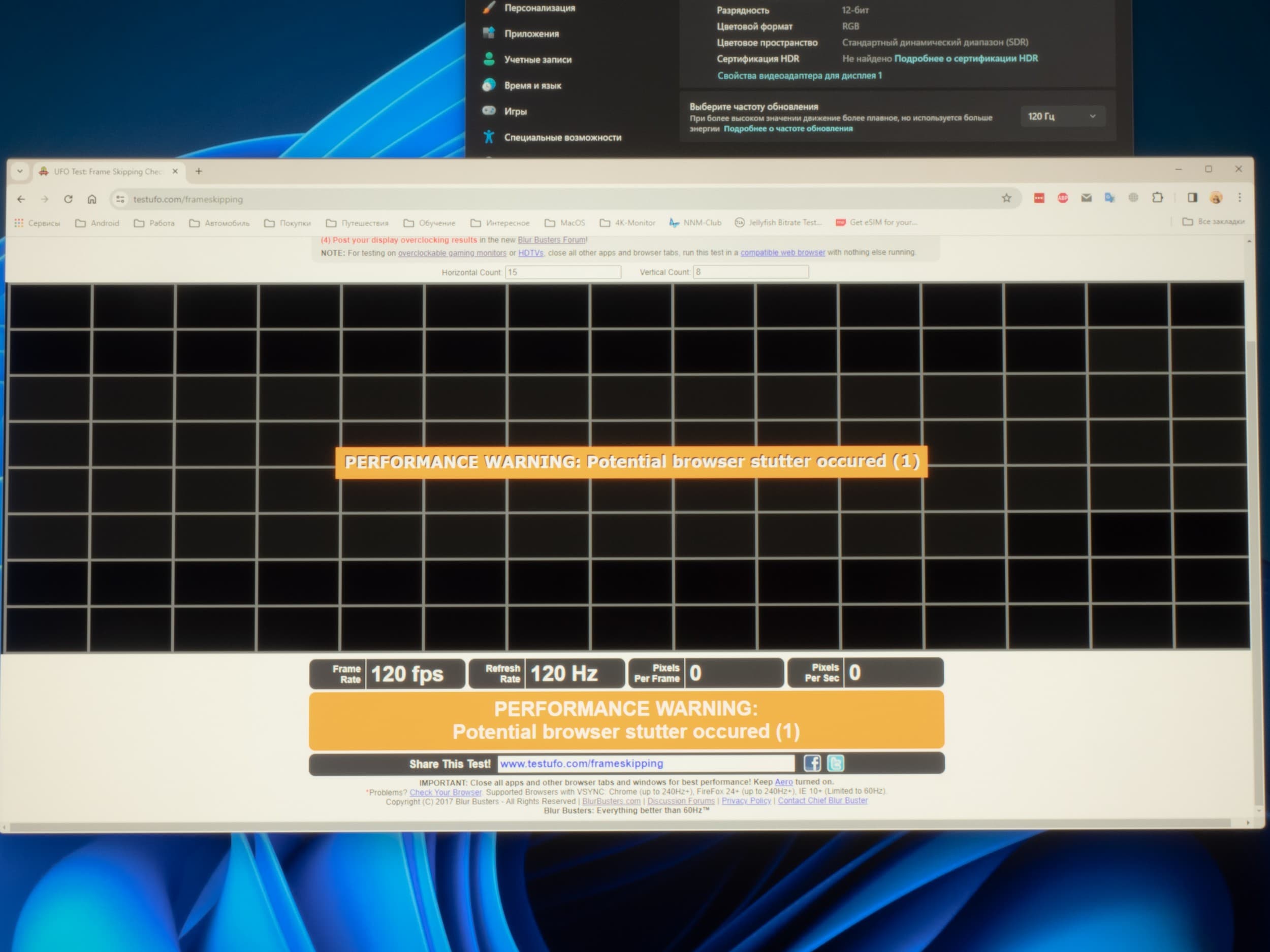 Дополнительно мы проверили стабильность кадровой частоты с помощью специального теста из набора TestUFO. 120 Гц оказались стабильными как при выводе 8-битного сигнала, так и с эмуляцией 10-12-битного.