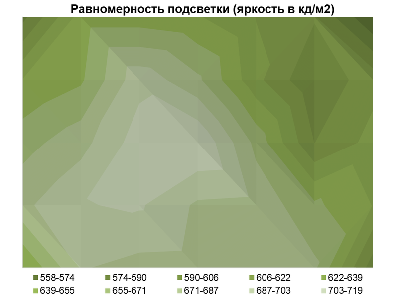 Измерения яркости проводились в 35 точках экрана, расположенных с шагом 1/6 от ширины и высоты экрана. Границы экрана не включены, настройки установлены в значения, обеспечивающие максимальную яркость.