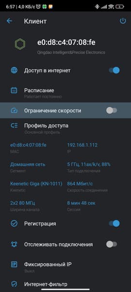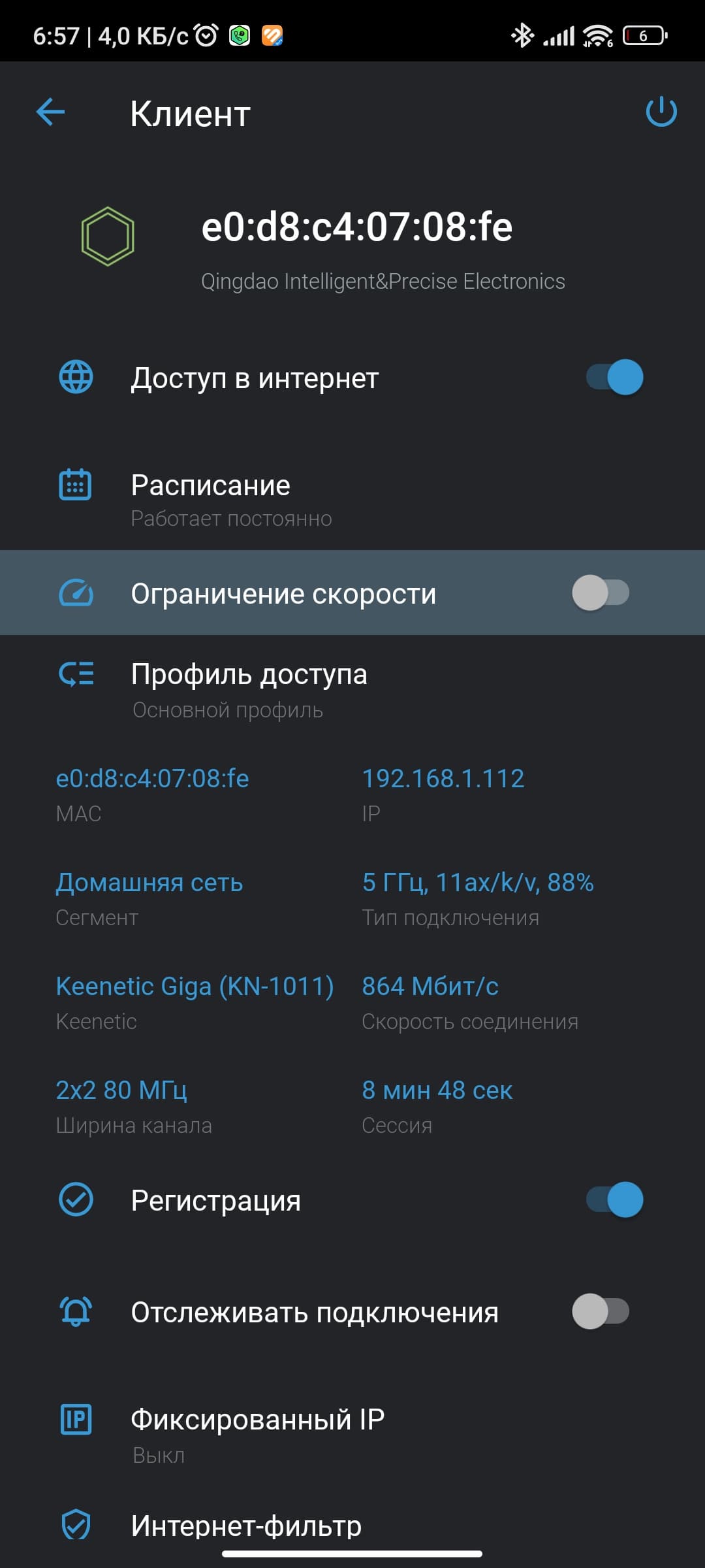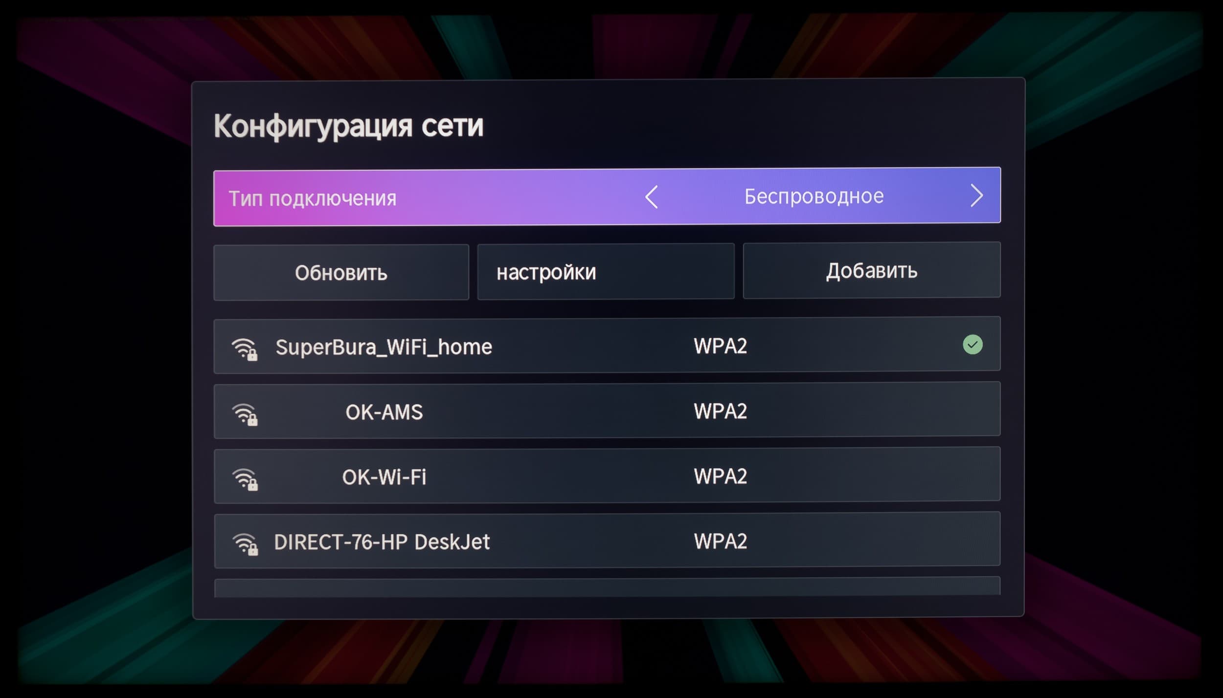 Впрочем, во втором случае, из-за ограничений скорости 100-мегабитного сетевого проводного адаптера, большая часть потребителей предпочтет воспользоваться встроенным Wi-Fi-адаптером стандарта 802.11a/b/g/n/ac/ax (2,4, 5 и 6 ГГц). В развернутой сети 5 ГГц на базе роутера Keenetic Giga, при нахождении телевизора в 5 метрах по прямой от него с преградой в виде монолитной стены, 55U8KQ продемонстрировал скорость подключения 864 Мбит/c (тип подключения — 11ax/k/v, 2×2 80 МГц). Очень достойный результат.