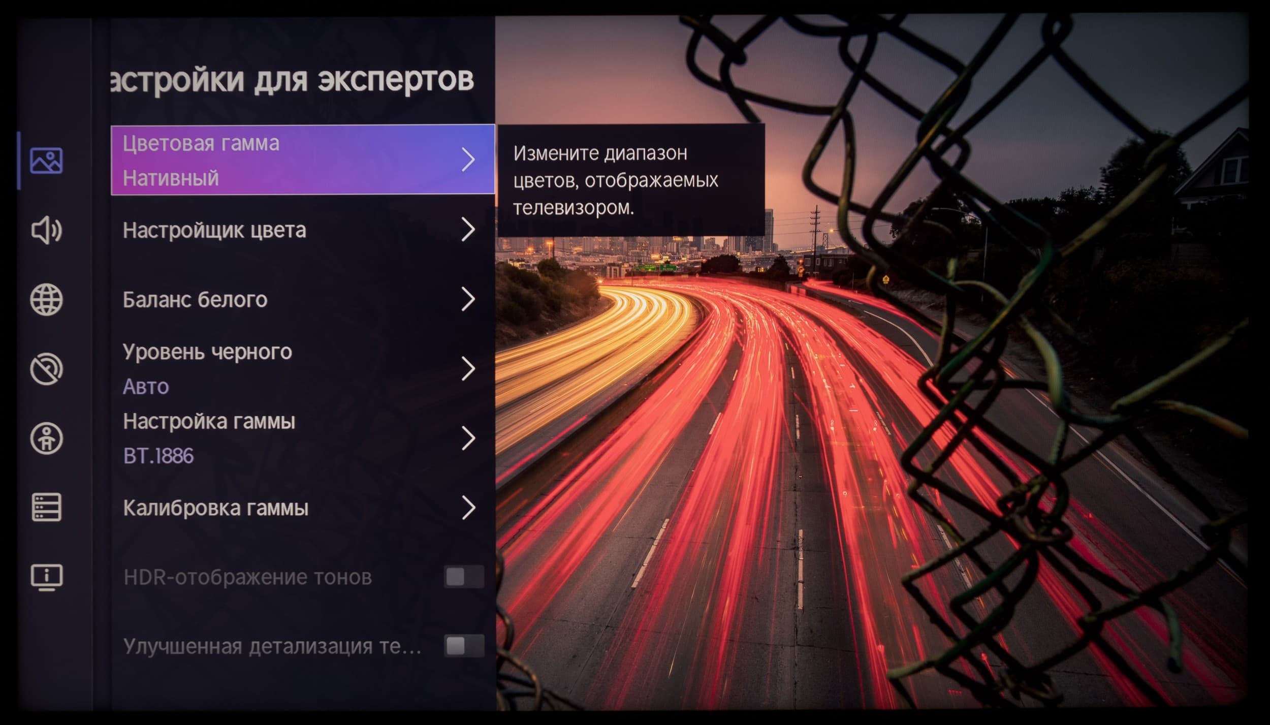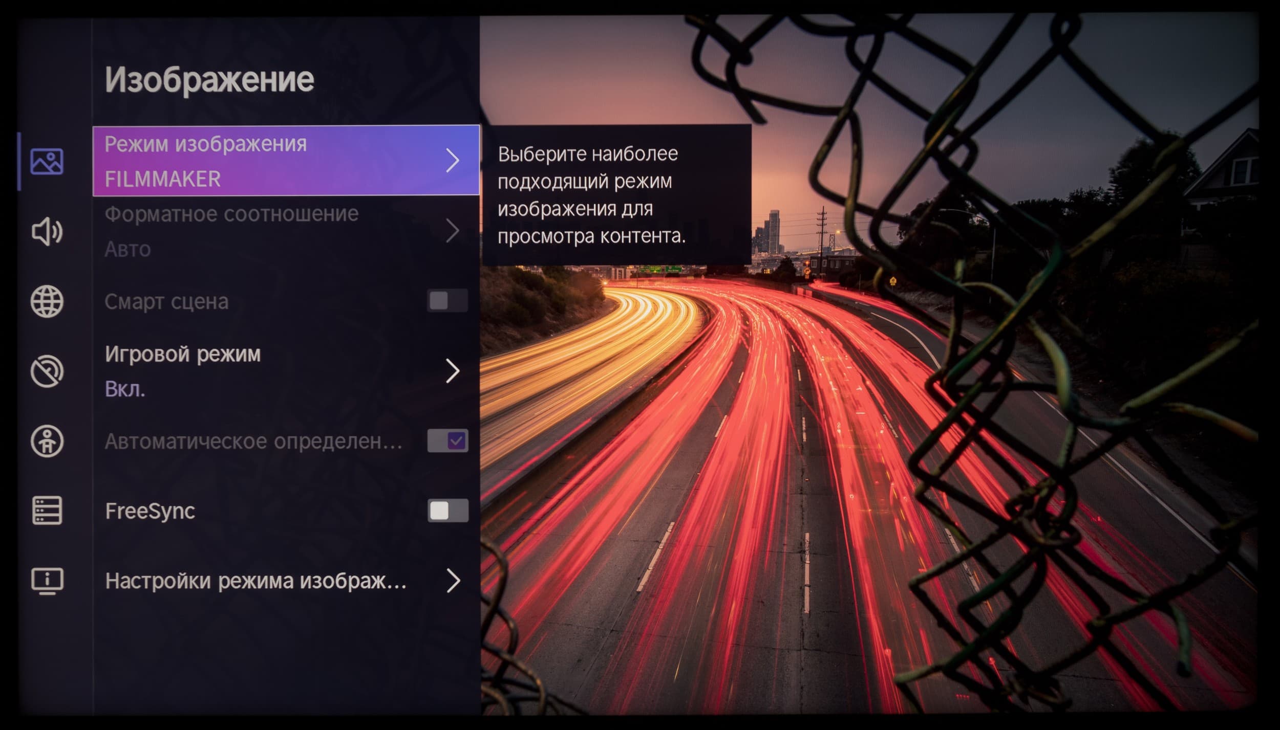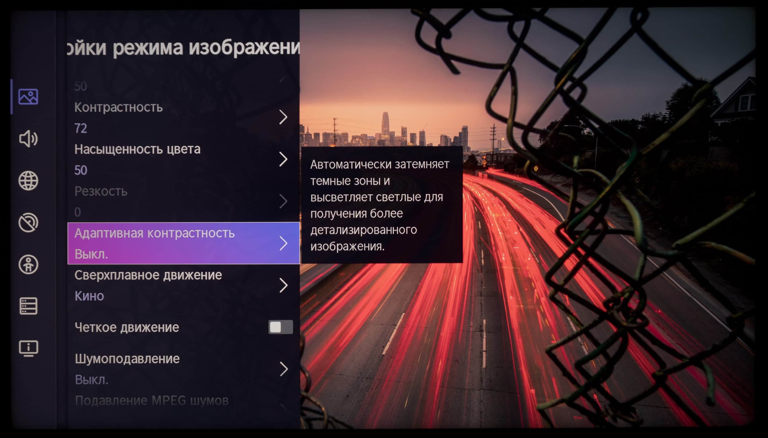 Все остальные настройки, ответственные за адаптивную контрастность, зональное управление яркостью, сглаживание и прочие программные функции — на ваше усмотрение, но для усиления эффекта от просмотра мы всё же рекомендуем их активировать, особенно если есть планы просмотра HDR-контента.