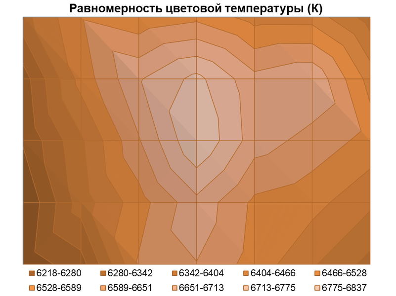Приятно удивила нас и равномерность цветовой температуры, что является редким явлением в случае со сложными системами подсветки Mini-LED: среднее отклонение от центральной точки составило 4,5%, максимальное — 9,1%. Диапазон ЦТ слегла превысил 600 К, с наибольшим снижением цветовой температуры в двух нижних углах панели. Если проводить параллель с огромным количеством куда меньших по размерам настольных мониторов, то попавший к нам экземпляр Hisense 55U8KQ — тот еще хорошист.