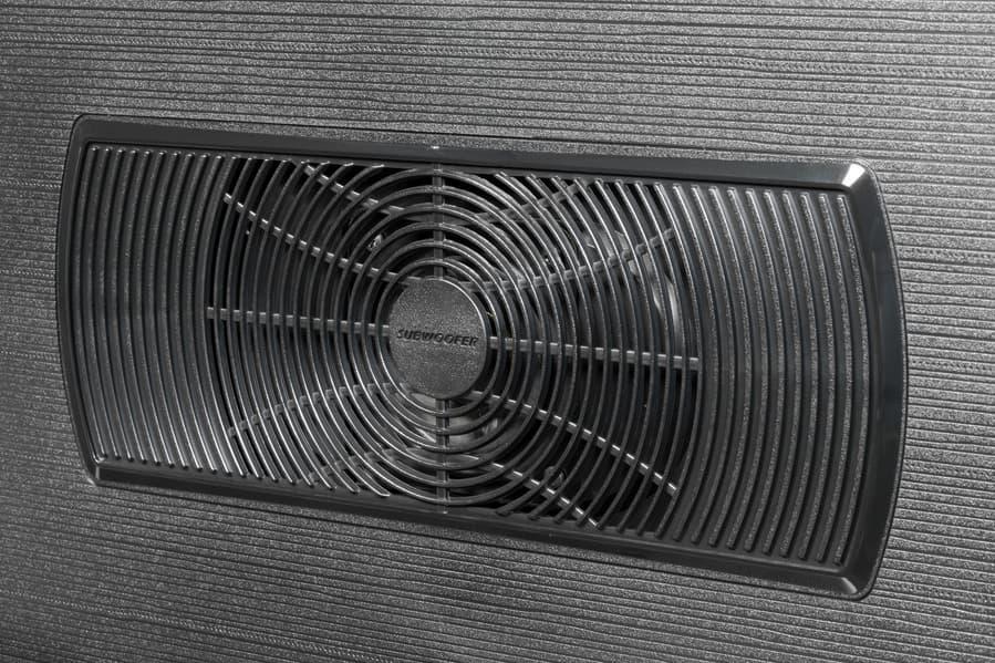 На нижнем и верхнем торцах кожуха и в верхней части есть вентиляционные решетки. За специальными решетками на нижнем торце находятся две пары средне-высокочастотных динамиков, а за решеткой на верхнем торце можно обнаружить два высокочастотных громкоговорителя с рупорными излучателями.
