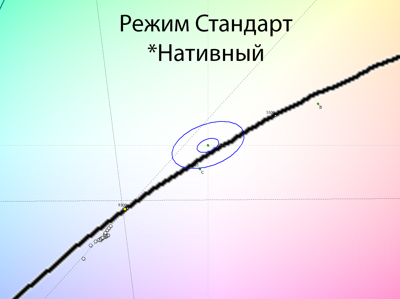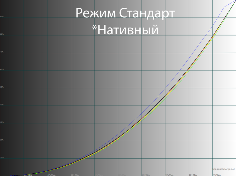 Крайне похожие результаты мы обнаружили и в режиме «Стандарт», выставленном по умолчанию, при активном широком цветовом охвате (Нативный), но с чуть большей интенсивностью на синем.