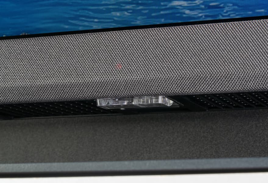 При выводе изображения на экран можно заметить, что ширина полей от области отображения до внешних границ экрана сверху и с боков равна 11 мм, хотя в Hisense говорят про 5,7 мм — видимо, учитывая только сам анодированный профиль. Спереди внизу на экране есть накладка высотой 38 мм, отделанная тканью с грубой фактурой. Смотрится это оригинально. На накладке есть логотип с блестящими буквами. В данном случае никаких изменений в сравнении с предыдущей моделью U8HQ мы не наблюдаем. Герой обзора и предшественник — как братья-близнецы.