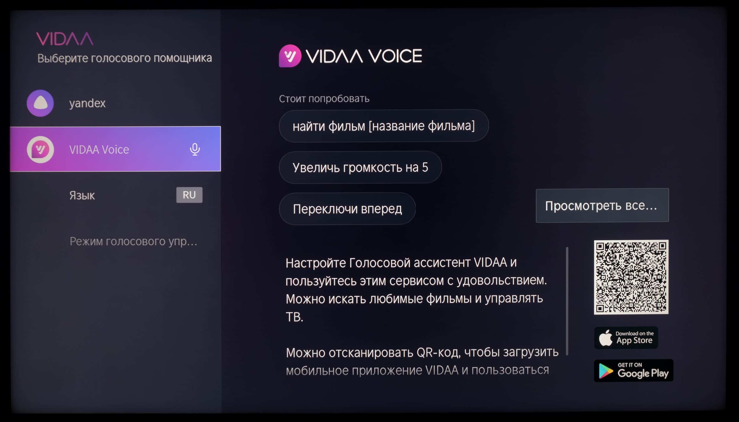 Основной же помощник Vidaa Voice поможет найти контент, который предоставляют ряд программ (например, Okko, Кинопоиск и YouTube) и предложит поискать информацию в интернете, хотя сказанная пользователем фраза может претерпеть некоторые изменения. Также помощник может самостоятельно ответить на некоторые вопросы, например какая сейчас погода за окном, переключить источник сигнала, изменить уровень громкости и яркости экрана, переключить канал или открыть какое-либо приложение.