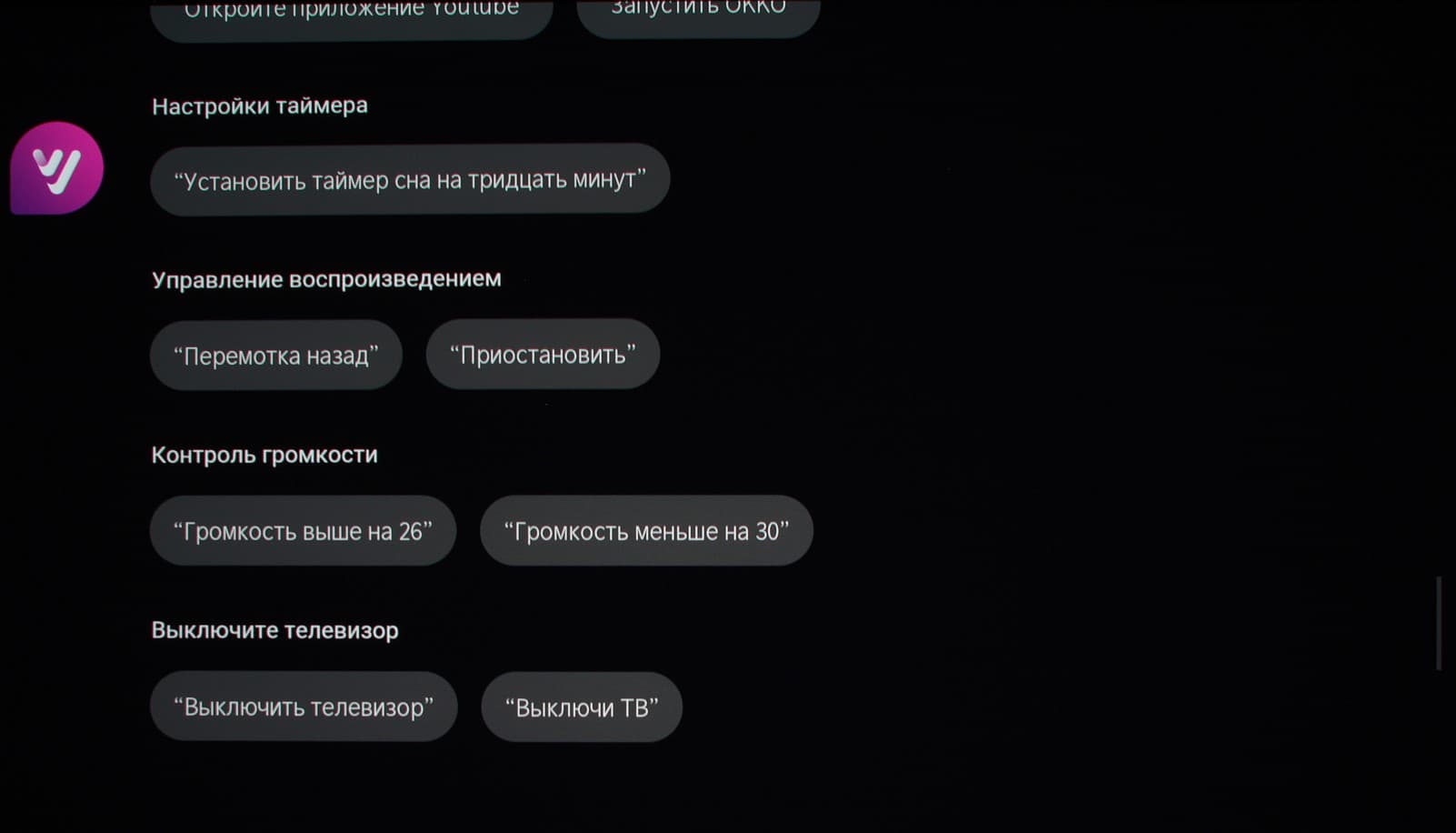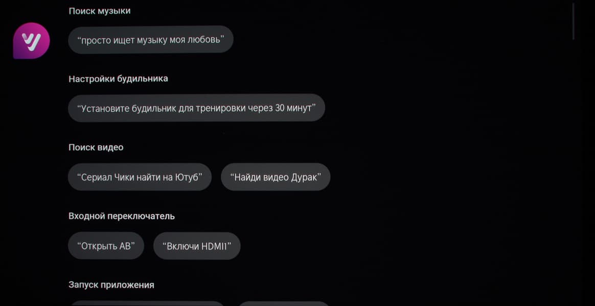 В ряде программ работает голосовой ввод текста. Также есть базовая интеграция с самим проектором, например, голосом можно менять громкость, выключать/включать звук и выключать сам проектор, переходить на главный экран, открывать меню с настройками, выбирать нужный вход и запускать программу по ее названию. По запросу «Что ты умеешь?» на экран выводится несколько примеров команд и запросов, которые понимает голосовой помощник.