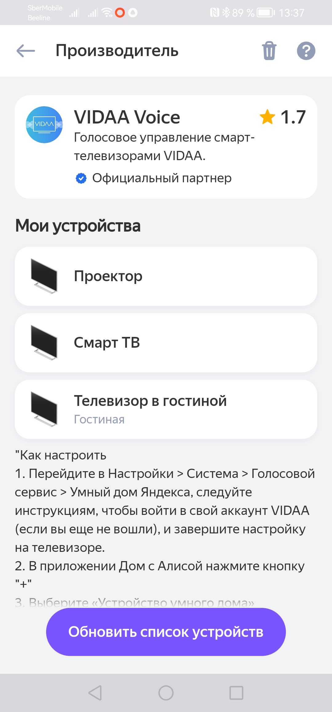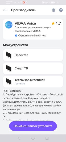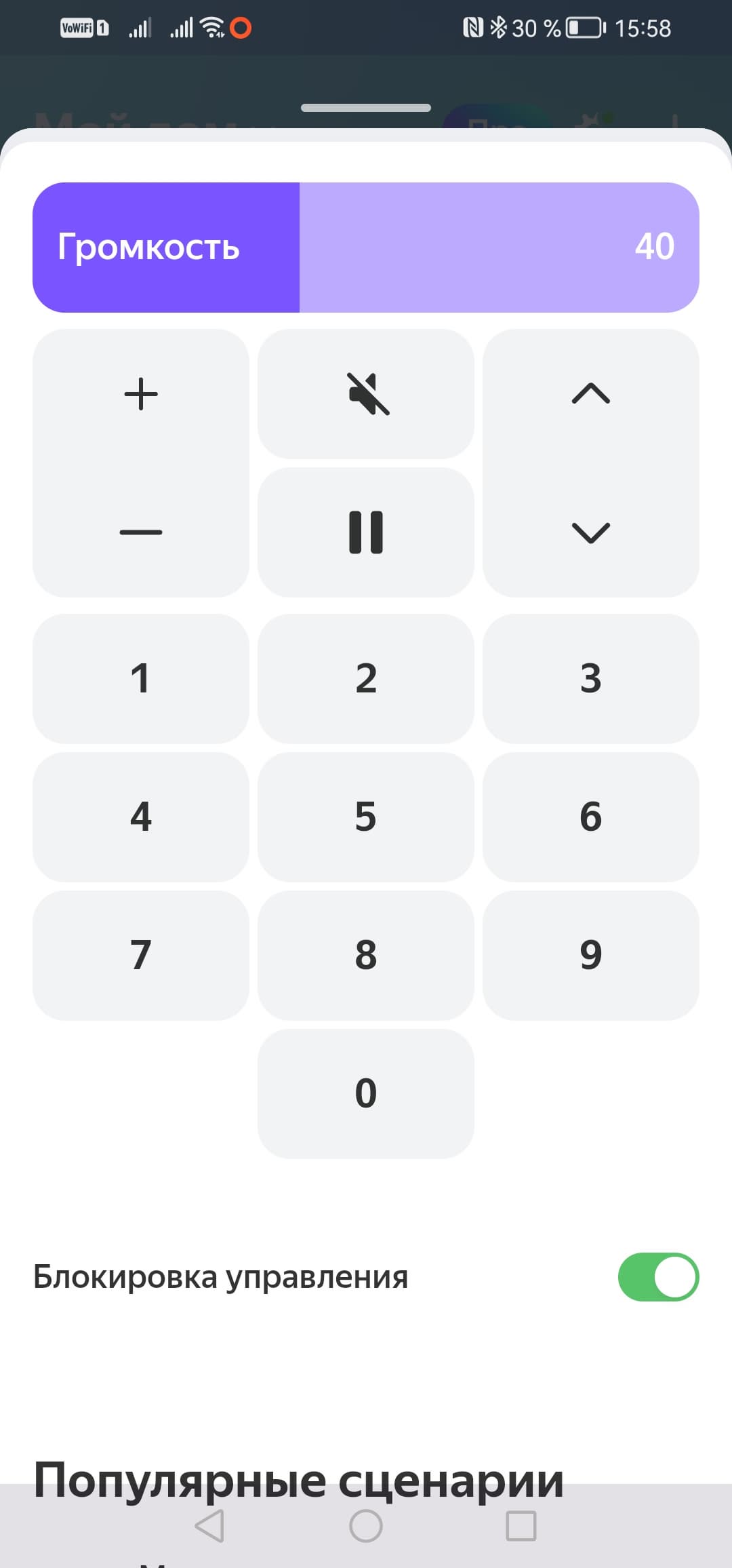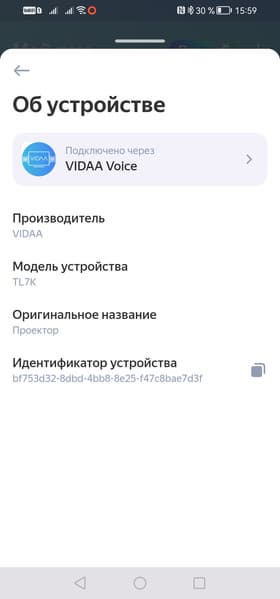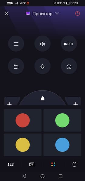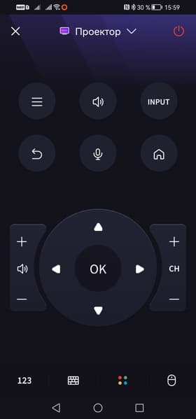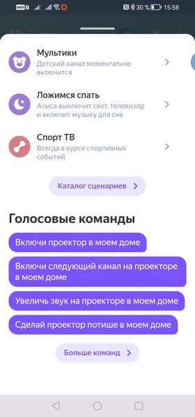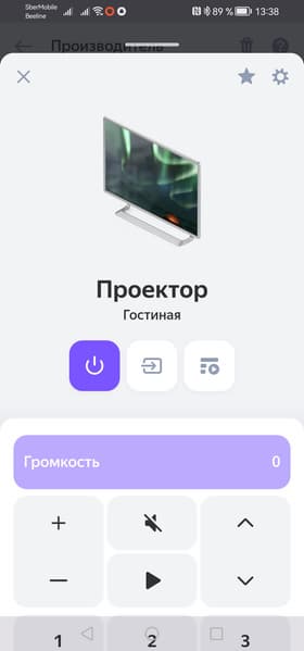 Управление может происходить с помощью виртуального пульта с ограниченной функциональностью, а также с помощью голосовых команд, отдаваемых Алисе. С помощью Алисы даже можно включить проектор, разумеется, если он остался подключенным к сети.
