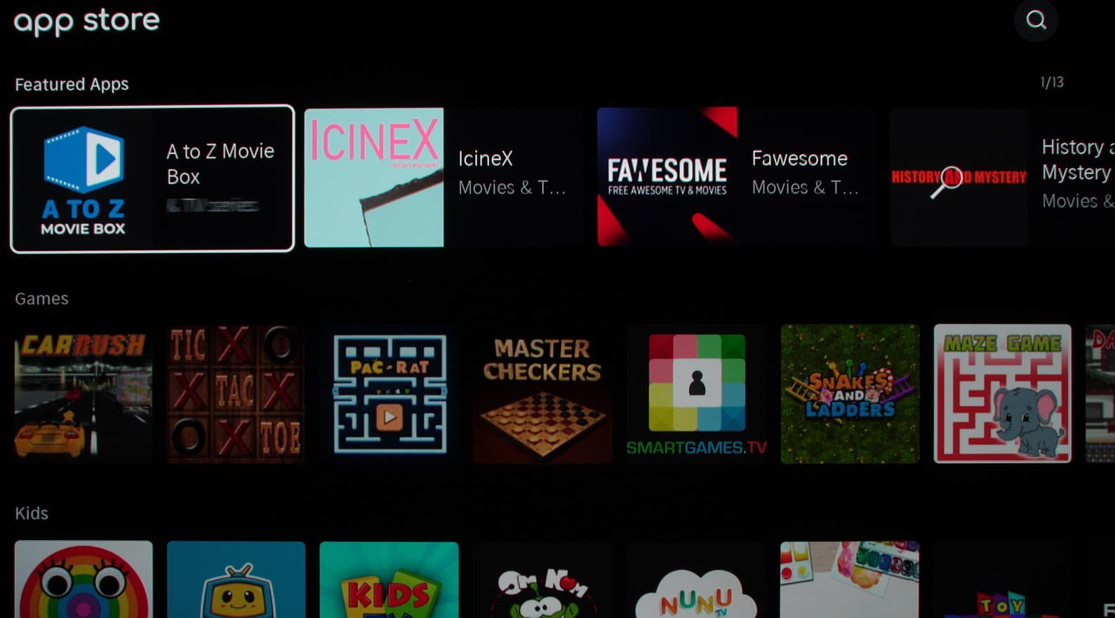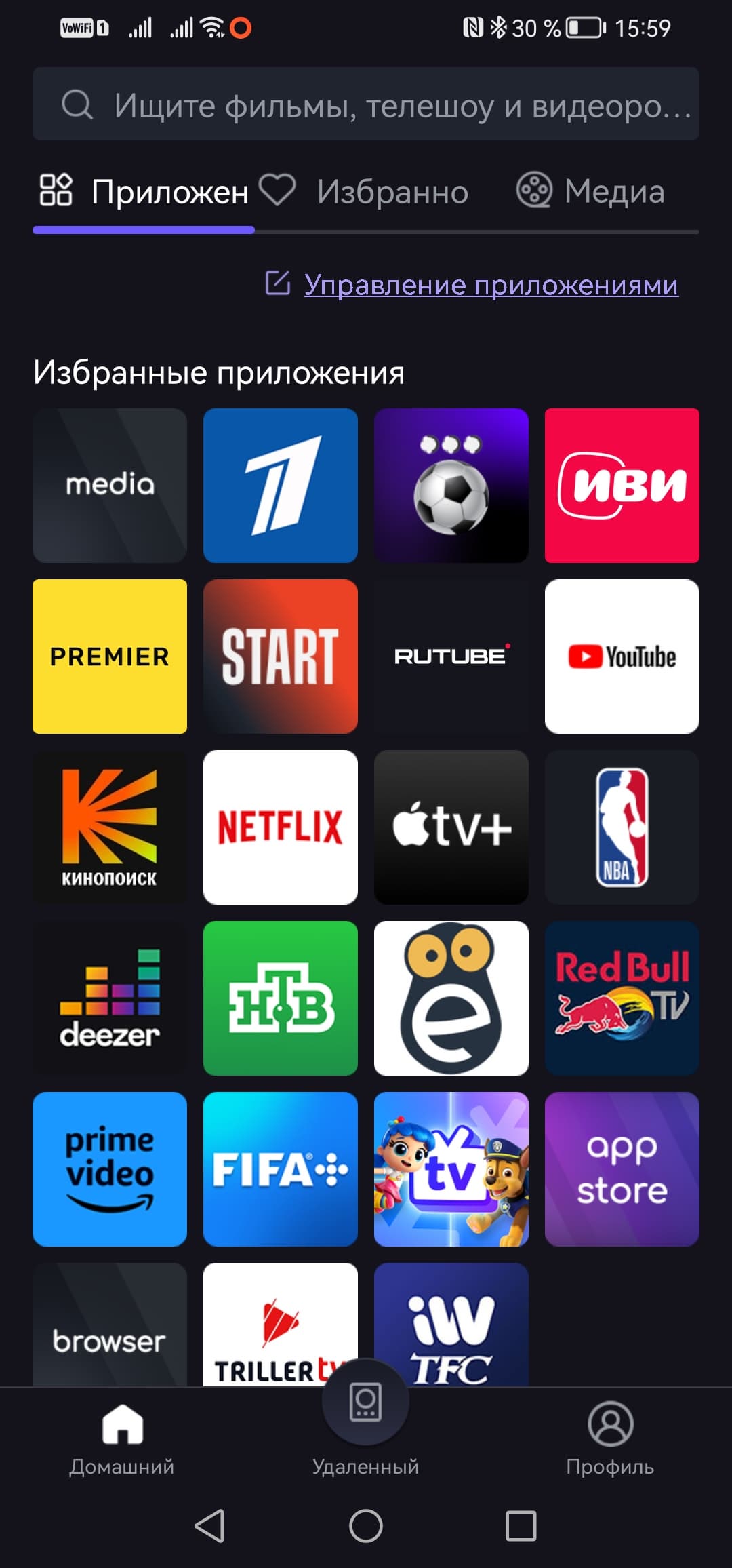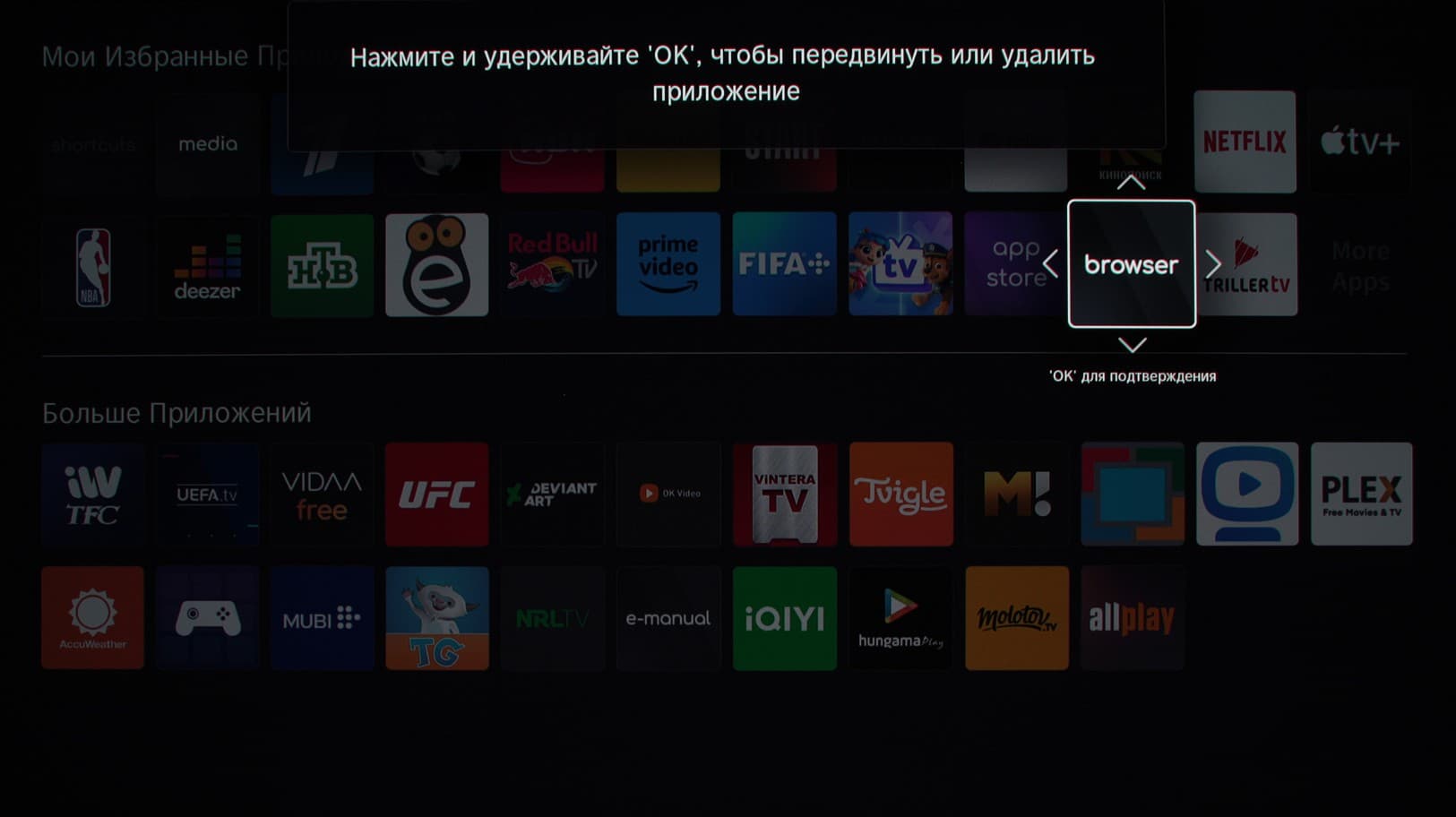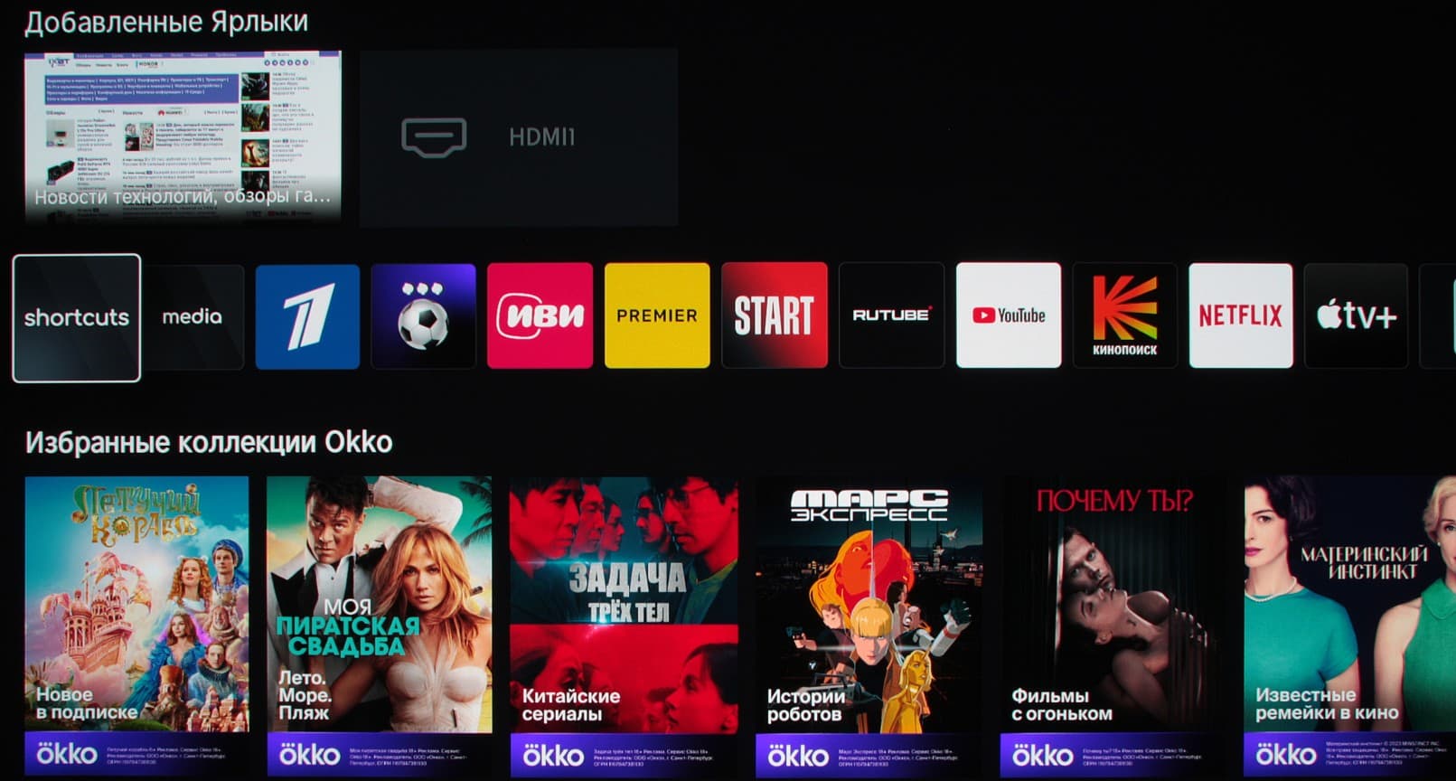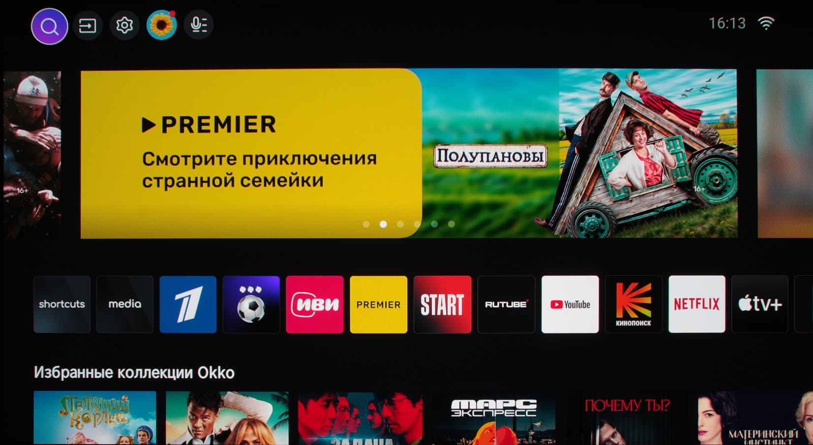 Ниже за лентой избранных приложений идут ленты рекомендованного контента из Okko, Иви и т. д. Есть магазин приложений, но выбор приложений не очень большой, даже в сравнении с официальным магазином Android TV.