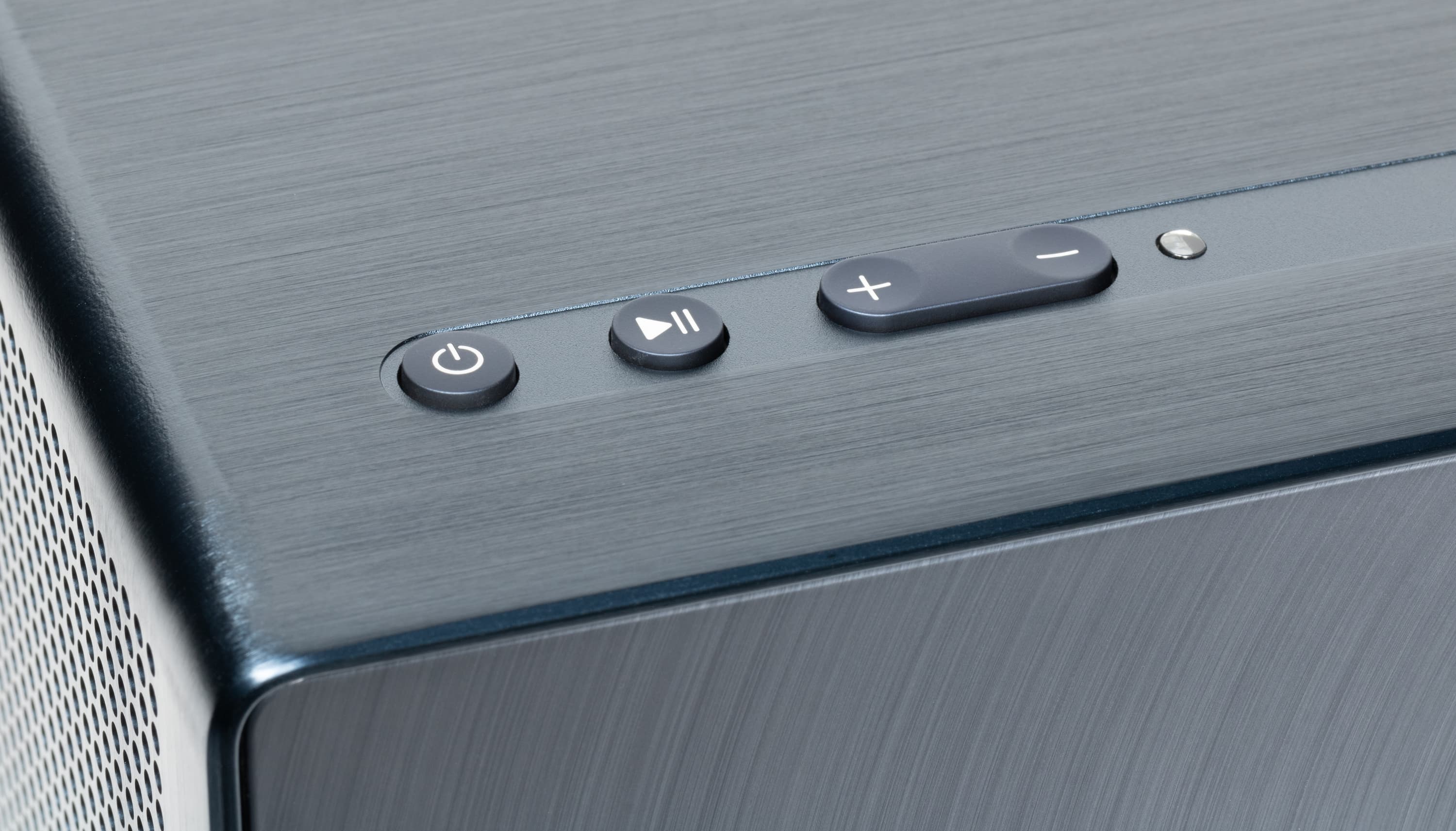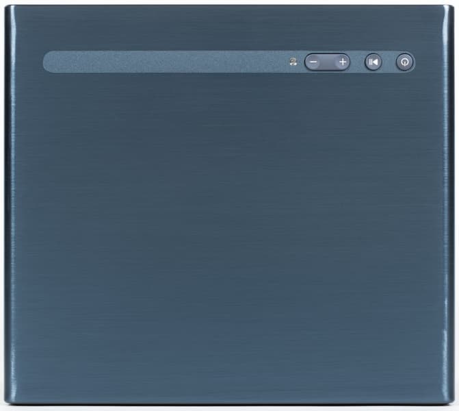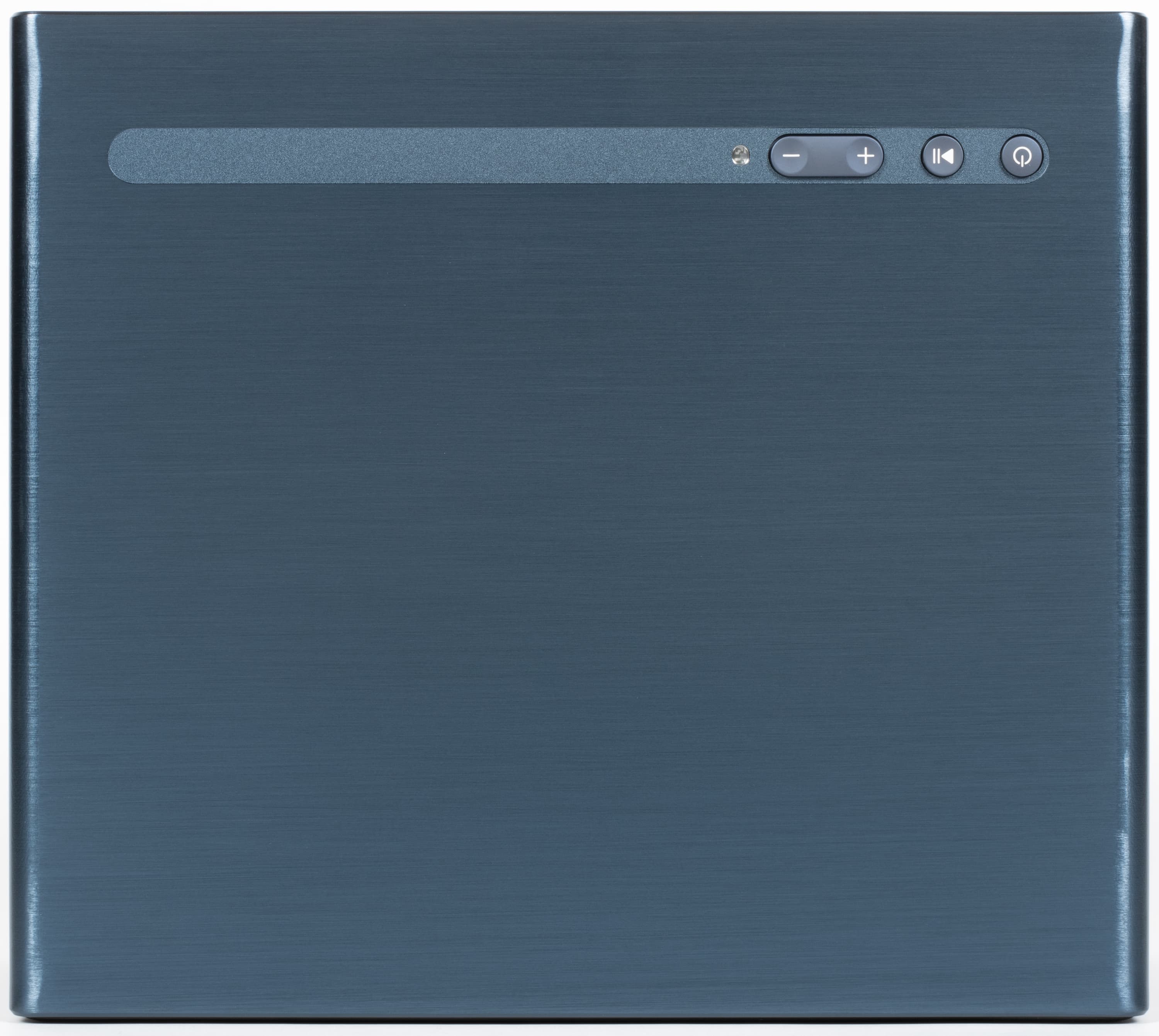 Сверху в передней части находятся оптический датчик (видимо, в текущей прошивке он не задействован), кнопка-качалка регулировки громкости, кнопка воспроизведения/паузы и кнопка питания, совмещенная с индикатором состояния, который неярко светится белым в режиме ожидания и не горит во время работы проектора.