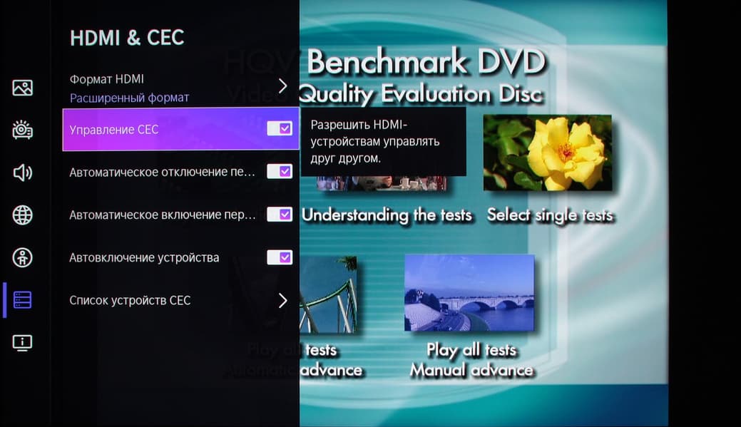 Есть поддержка управления по HDMI (функция CEC): кроме управления питанием, на подключенное устройство передаются нажатия на курсорные кнопки, на кнопки ввода и управления воспроизведением.
