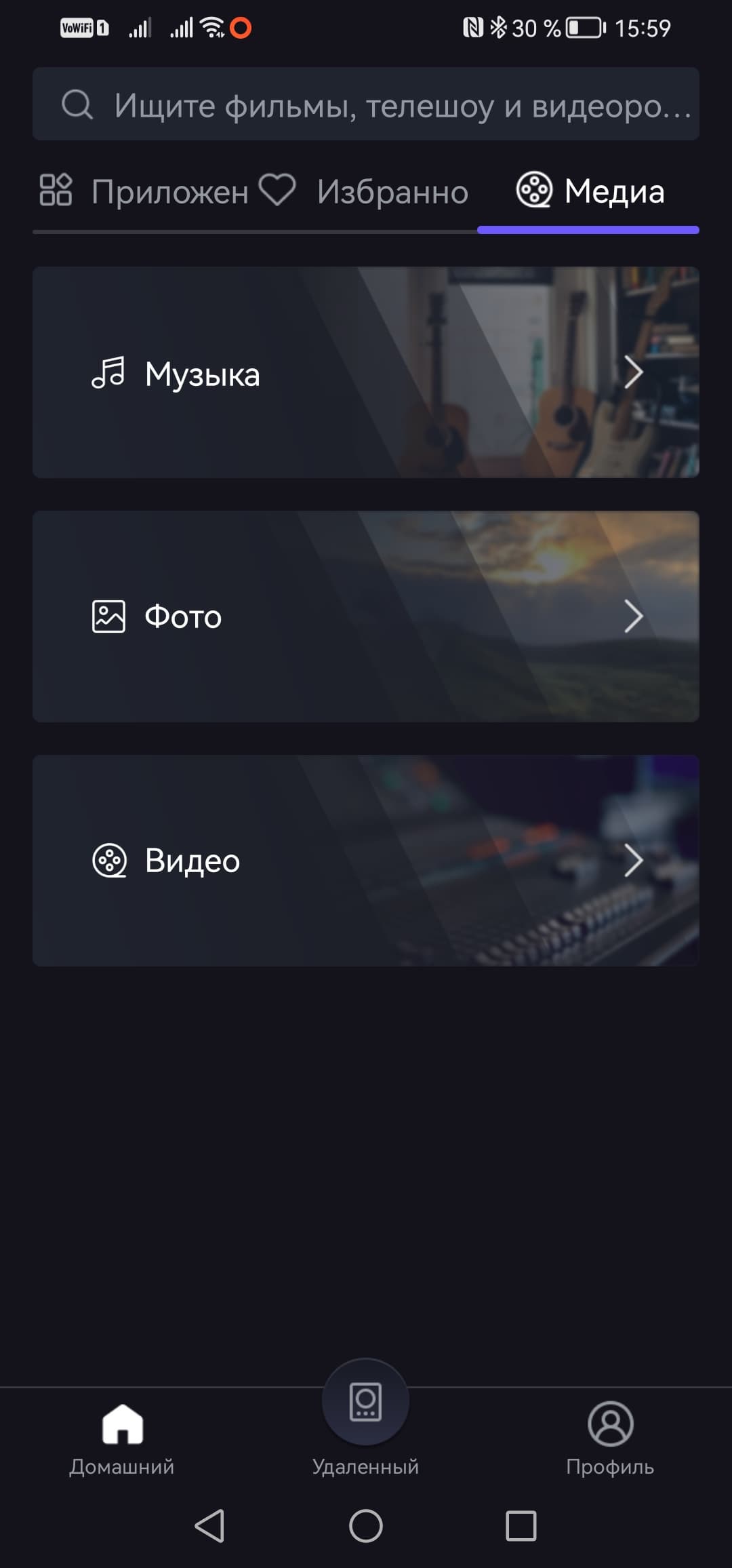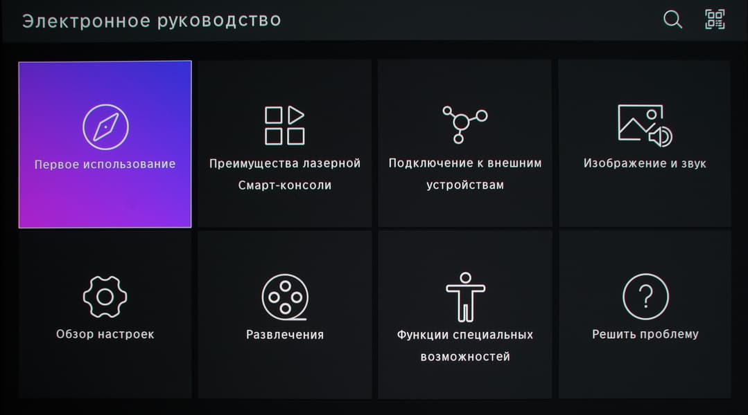 Программной платформой для этого проектора служит операционная система, основанная на ядре Linux. Применяется пользовательская оболочка Vidaa. Заглавная страница интерфейса типична для современных умных проекторов и телевизоров. Вверху слева по горизонтали выстроились значки запуска текстового поиска, выбора источника, входа в меню с настройками, работы с профилем пользователя и перехода к настройкам голосового помощника. В верхнем правом углу — текущее время (жалко, что без даты) и индикатор подключения к сети. Ниже — баннеры с рекламой рекомендуемого контента. Еще ниже — горизонтальная лента из квадратных значков избранных приложений.