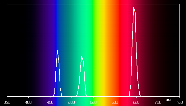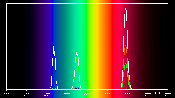 Видно, что цвета очень хорошо разделены, и перекрестное подмешивание цветов минимальное. Узкие пики подтверждают сведения о лазерных источниках света.
