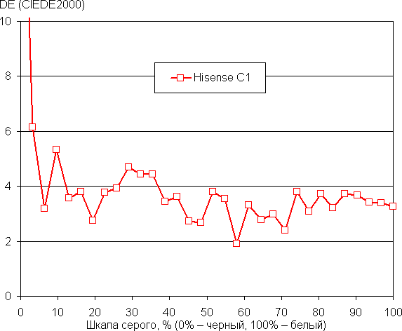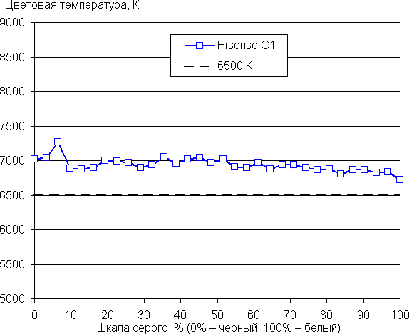 Близкий к черному диапазон можно не учитывать, так как в нем цветопередача не так важна, а погрешность измерения цветовых характеристик высокая. Видно, что в этом случае цветовая температура достаточно близка к 6500 К и ΔE ниже 10, при этом цветовая температура и ΔE мало изменяются на всей имеющей значение части шкалы серого, что благоприятно сказывается на субъективном восприятии цветового баланса. Отметим, что при желании, тонкую коррекцию цветового баланса нужно выполнять индивидуально под конкретный экран.