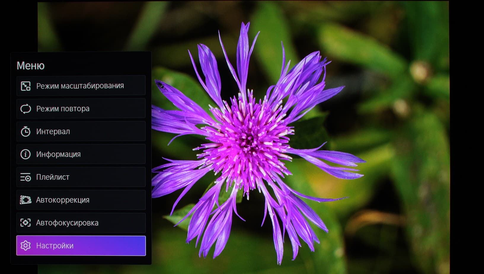 Были опробованы жесткие диски, внешние SSD и обычные флешки. Два протестированных жестких диска работали от любого из двух USB-портов. Отметим, что проектор поддерживает USB-накопители с файловыми системами FAT32 и NTFS (exFAT не поддерживается), а с кириллическими названиями файлов и папок не было никаких проблем. Плеер проектора обнаруживает все файлы в папках, даже если на диске очень много файлов (более 100 тысяч), что получается далеко не у каждого «умного» ТВ. Можно создать раздельные списки воспроизведения с картинками, видео или музыкой, при этом их можно затем просто воспроизвести, а список с музыкой потом еще и использовать при просмотре слайд-шоу.