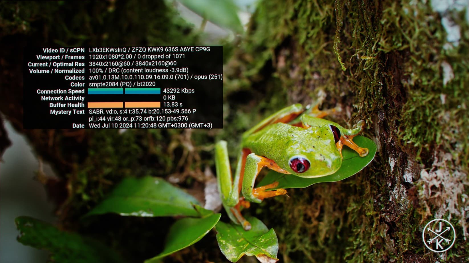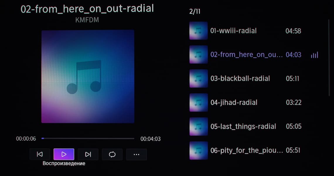 Большинство из опробованных современных файлов высокого разрешения без проблем воспроизводились в режиме аппаратного декодирования, вплоть до вариантов с разрешением 4К при 60 кадр/с. В видеофайлах поддерживается аппаратное декодирование звуковых дорожек как минимум в форматах AAC, AC3, DTS, MP2 и WMA. Поддерживается воспроизведение видеофайлов HDR (Dolby Vision, HDR10 и HLG, контейнеры MP4, TS, WebM и MKV, кодеки AV1, VP9 и H.265), а в случае файлов с 10 бит на цвет, согласно визуальной оценке, градаций оттенков больше, чем у 8-битных файлов. Поддерживаются внешние и встроенные субтитры (русские должны быть в кодировке Unicode). Можно смотреть копии дисков Blu-ray, но только по файлам, при этом все равно можно переключаться между звуковыми дорожками (максимум 15), но субтитры уже не поддерживаются.