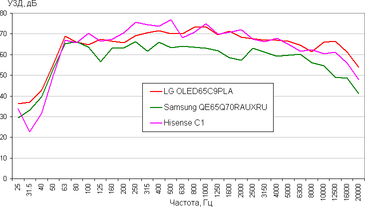 Встроенные громкоговорители громкие (82 дБА согласно замерам), паразитных резонансов в явном виде нет, звук достаточно приятный, долго и громко слушать музыку с их помощью можно. Стереофонический эффект присутствует. В целом качество для встроенных источников звука очень хорошее. Сравним АЧХ этого проектора с АЧХ двух телевизоров (АЧХ получена с помощью шумомера при воспроизведении звукового файла с розовым шумом, замер УЗД в интервалах по 1/3 октав):