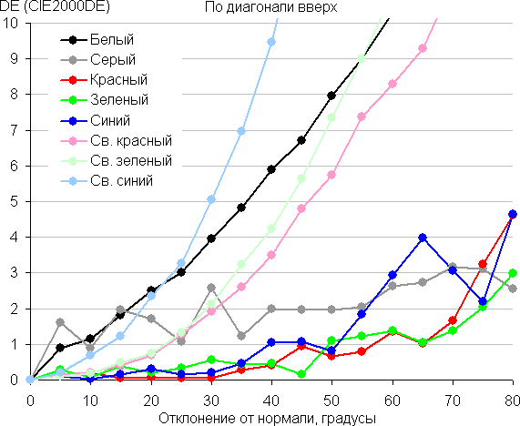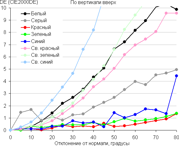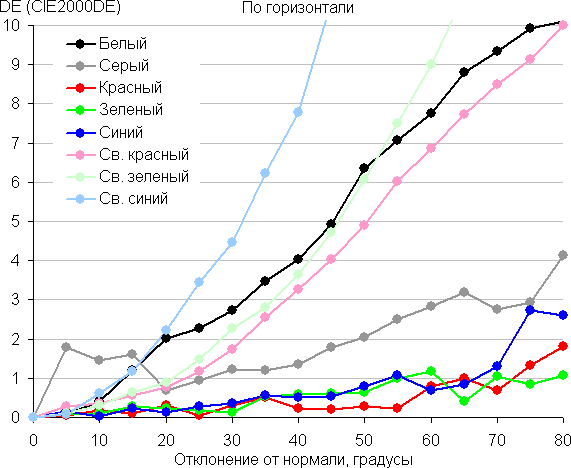 Для количественной характеристики изменения цветопередачи мы провели колориметрические измерения для белого, серого (127, 127, 127), красного, зеленого и синего, а также светло-красного, светло-зеленого и светло-синего полей во весь экран с использованием установки, подобной той, что применялась в предыдущем тесте. Измерения проводились в диапазоне углов от 0° (датчик направлен перпендикулярно к экрану) до 80° с шагом в 5°. Полученные значения интенсивностей были пересчитаны в отклонение ΔE относительно замера каждого поля при перпендикулярном положении датчика относительно экрана. Результаты представлены ниже: