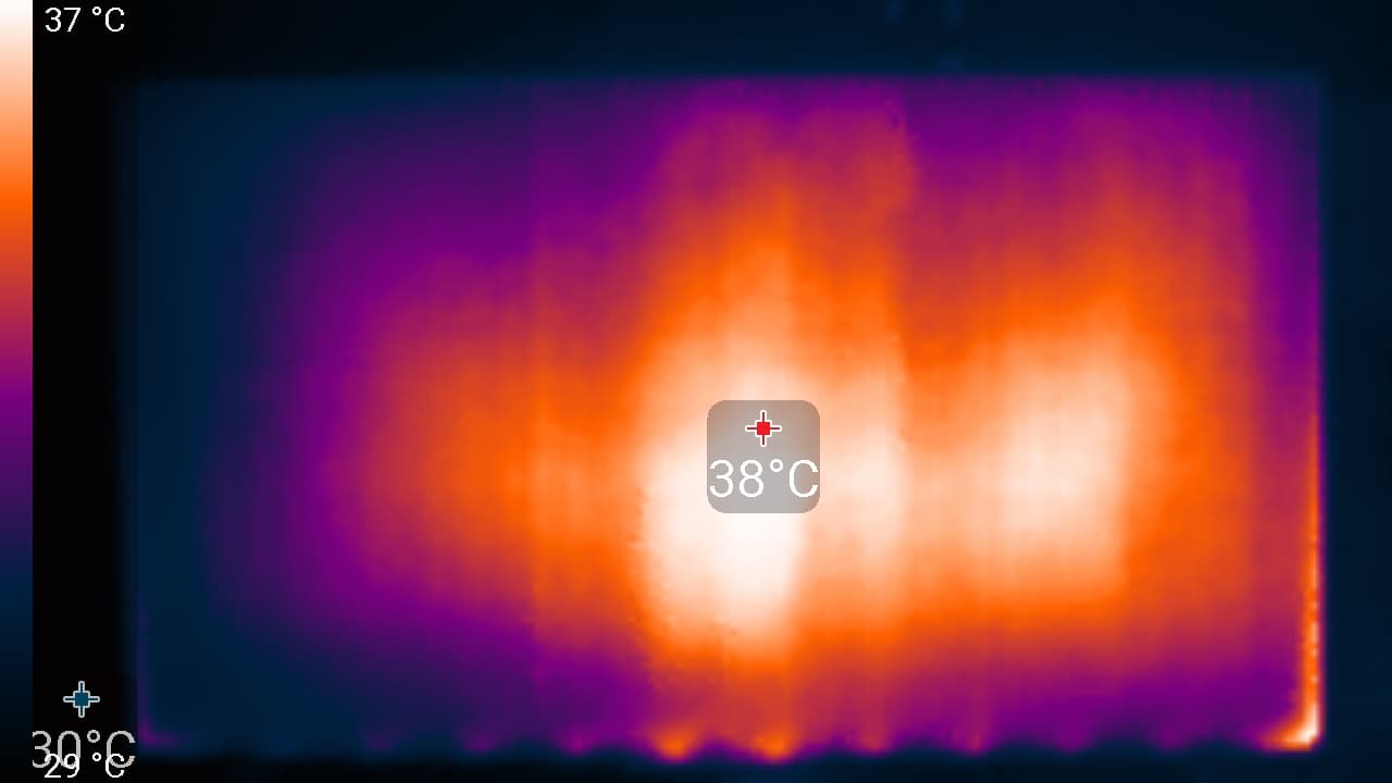Нагрев телевизора спереди можно оценить по приведенному снимку с ИК-камеры, полученному после долговременной работы на максимальной яркости в помещении с температурой примерно 24 °C: