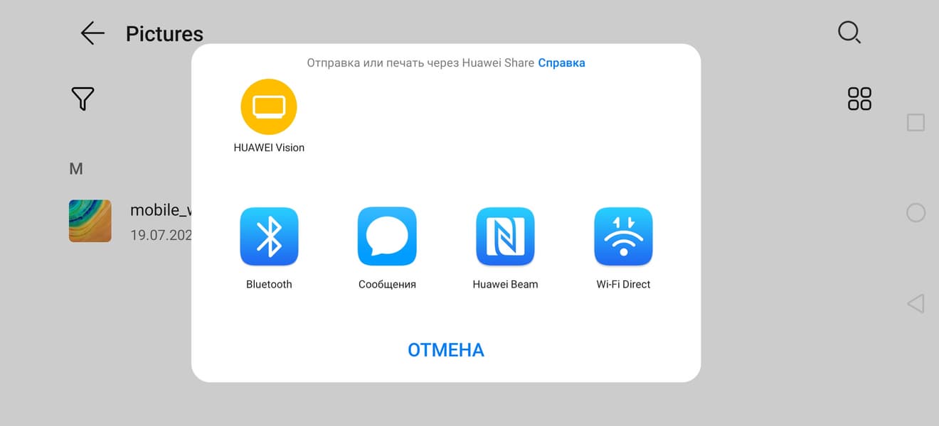Есть еще одна функция, отчасти связанная с удаленным управлением, — это удобная пересылка файлов между мобильным устройством и телевизором. Называется она Huawei Share и поддерживается некоторыми смартфонами (и планшетами) Huawei. На смартфоне значок Huawei Vision появляется в меню Отправить первым среди доступных вариантов, а на телевизоре отправить файл на смартфон можно с помощью встроенного мультимедийного плеера, при этом смартфон и телевизор необязательно должны находится в одной сети.
