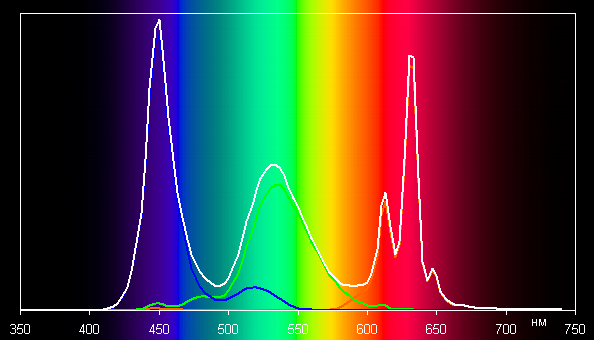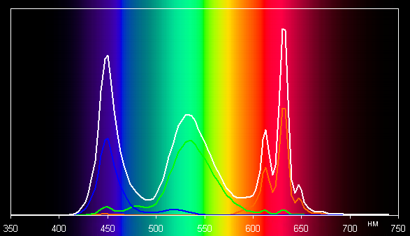 Ниже приведен спектр для белого поля (белая линия), наложенный на спектры красного, зеленого и синего полей (линии соответствующих цветов):