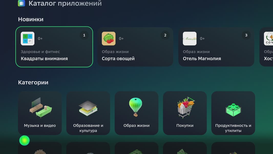 Заглавную страницу можно просто прокручивать вверх вниз (а горизонтальные ленты вправо-влево, если они не помещаются на экране), а можно выбирать нужную категорию в столбце закладок. Категорий пять: устройства умного дома Сбер, видео- и музыкальные сервисы и простенькие игры с голосовым помощником. Отметим,что бесплатного контента в Салют (да и в ТВ-оболочке HarmonyOS) практически нет. Можно смотреть несколько бесплатных ТВ-каналов и слушать радиостанции (во время тестов радио не работало — не было звука). За все остальное нужно платить. В ряде случаев есть условно бесплатный ознакомительный период, но для его активации нужно вводить данные банковской карты, и не факт, что получится отключить автоматическое списание средств по окончании этого периода. Часть приложений слегка замаскированы. Например, ТВ Каналы — это сервис Смотрешка, Видео из интернета — это YouTube в виде веб-версии для Smart TV, значок с телефонной трубкой — это Telegram. Плитка Каталог приложений открывает доступ к ряду приложений, большая часть из которых — это смартапы, то есть простые приложения-сервисы, делающие что-то совсем простое и незатейливое.