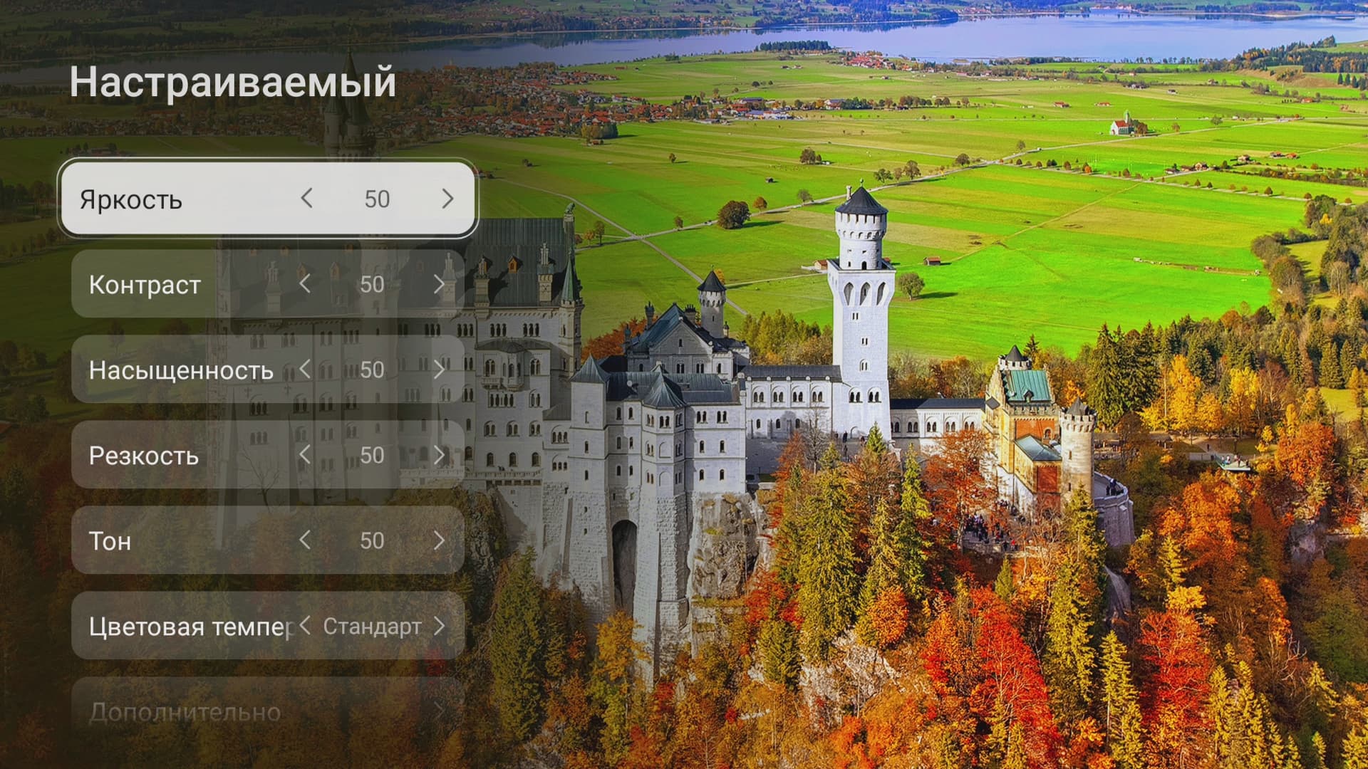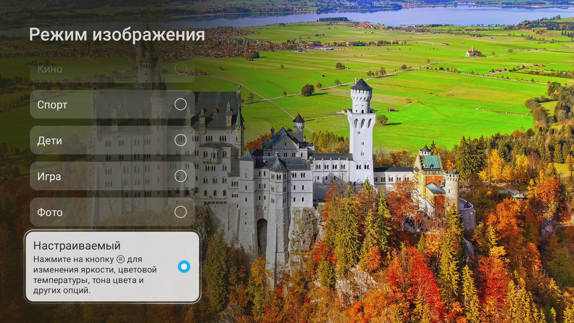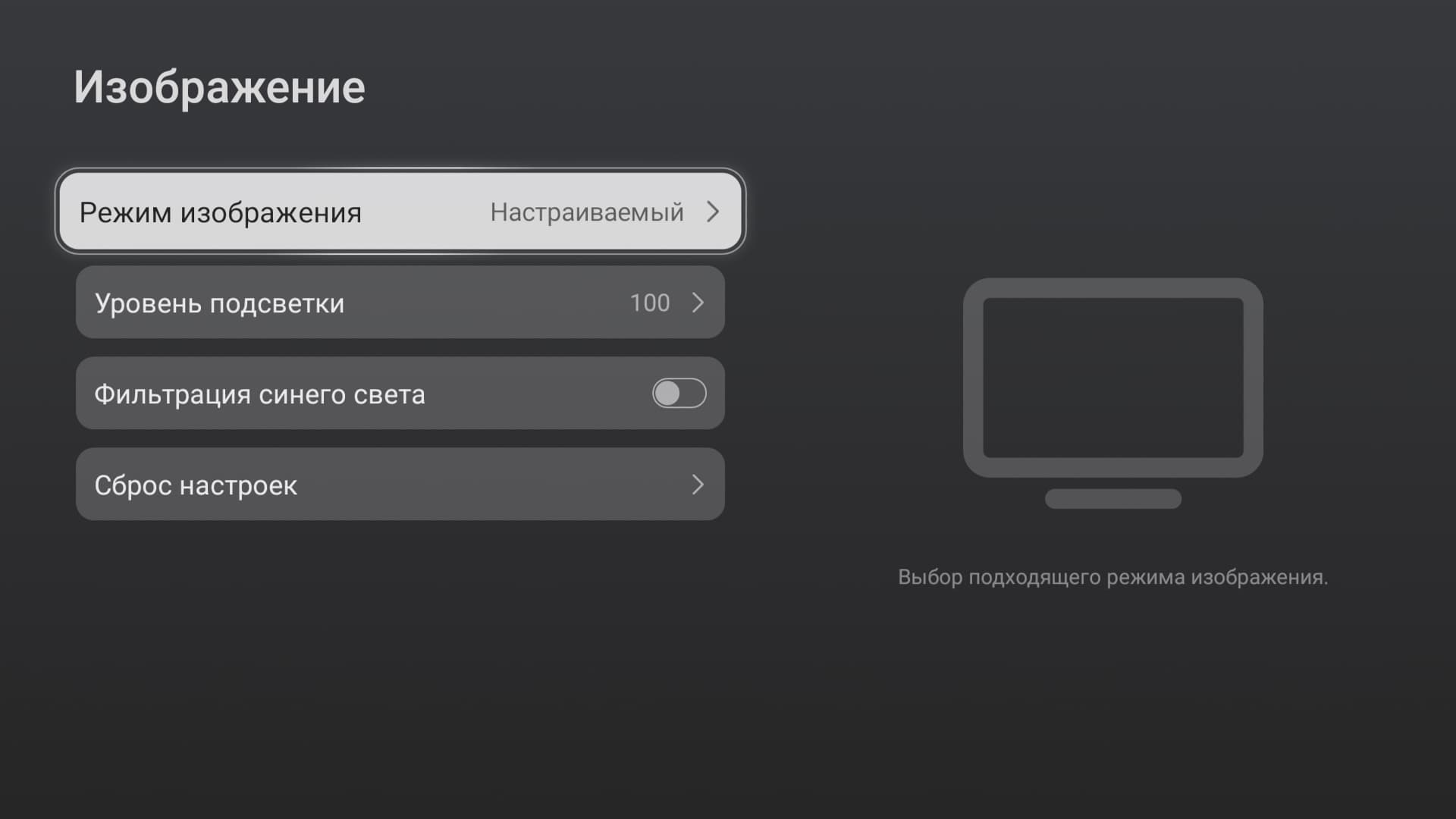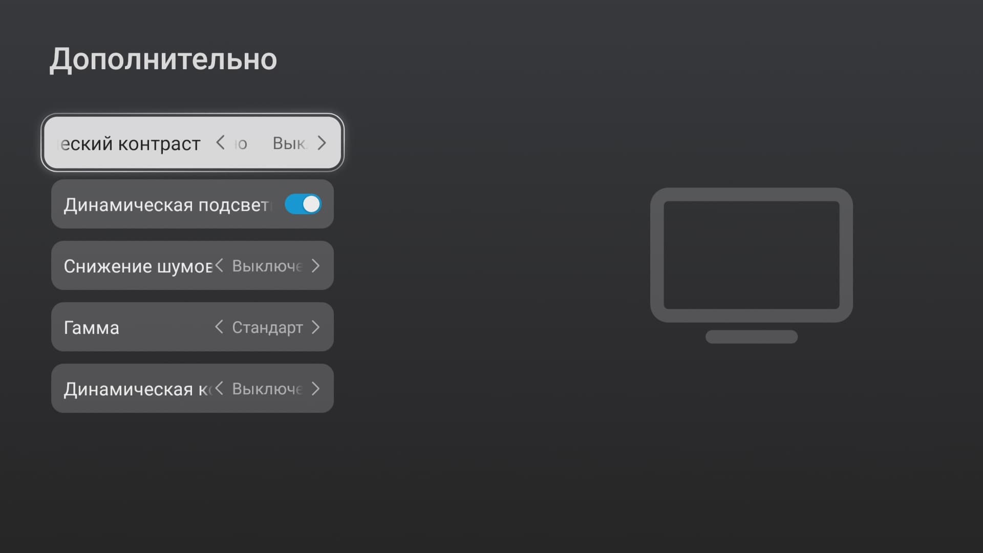Подменю с настройками изображения несколько запутанное. Сначала пользователь видит меню из четырех пунктов, из которого можно перейти к выбору профиля (режима) изображения в списке на фоне тестовой картинки. Дойдя до профиля Настраиваемый и нажав на кнопку Свойства, пользователь наконец-то видит список с привычными настройками Яркость, Контраст и т. д., а выбрав пункт Дополнительно в этом списке, пользователь доходит до четвертого списка с еще несколькими настройками.