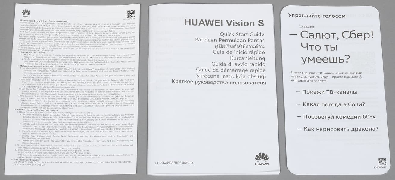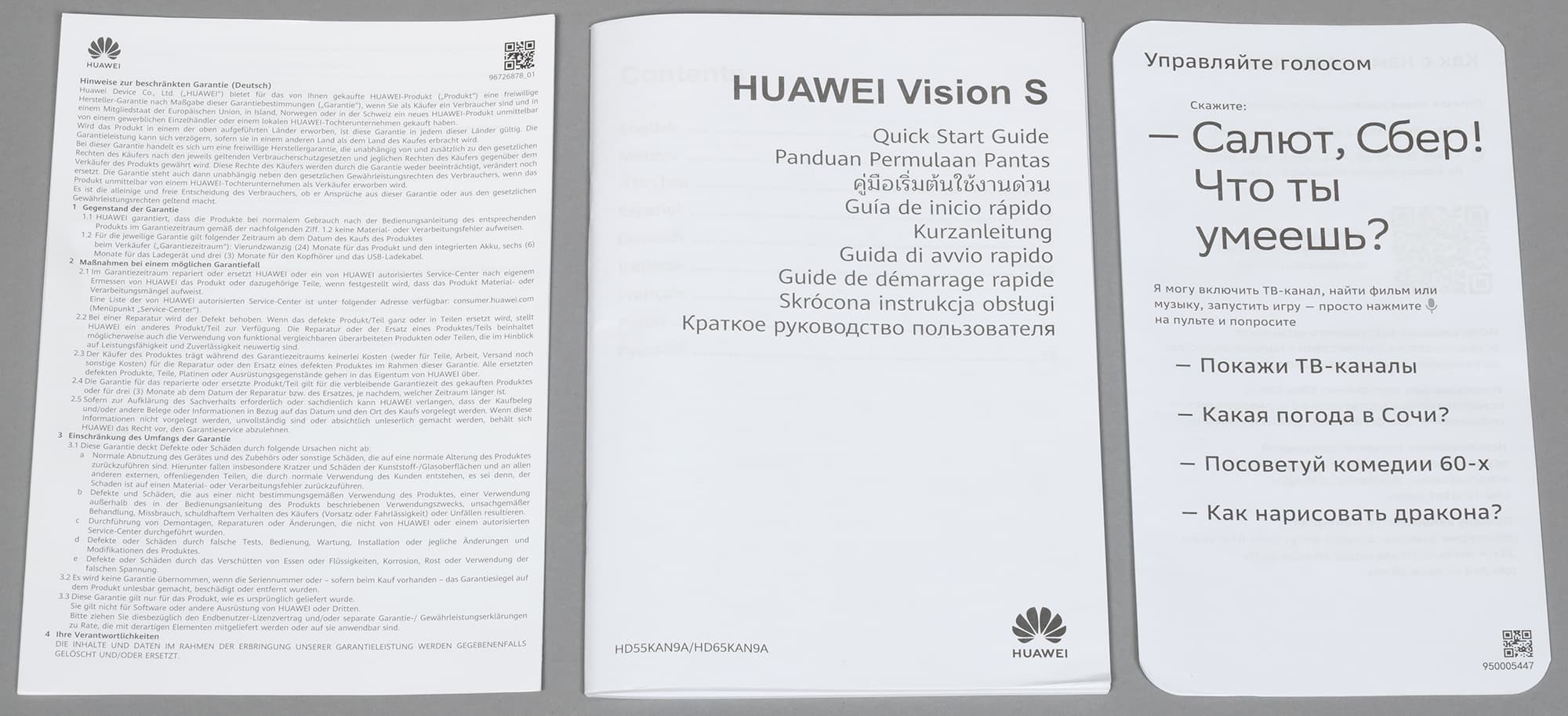 Из напечатанной документации к телевизору прилагаются гарантийный талон, многоязычное (раздел на русском языке присутствует) краткое руководство пользователя (его можно загрузить с сайта компании) и справка-листовка по Сбер Салют.