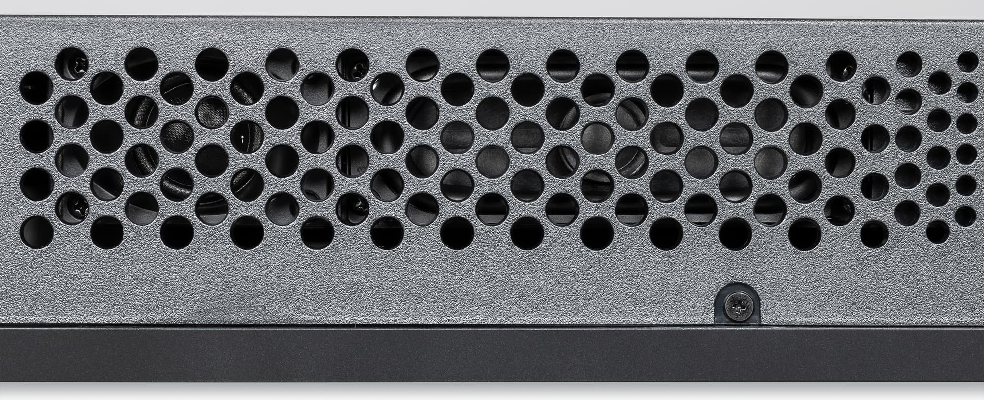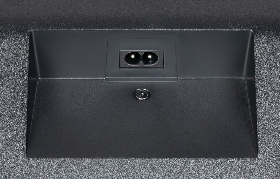 Задняя панель в верхней части изготовлена из тонкого листа стали и имеет стойкое черное матовое покрытие. Выступающий назад кожух в нижней части с заходом на нижний торец изготовлен из черного пластика с матовой поверхностью.