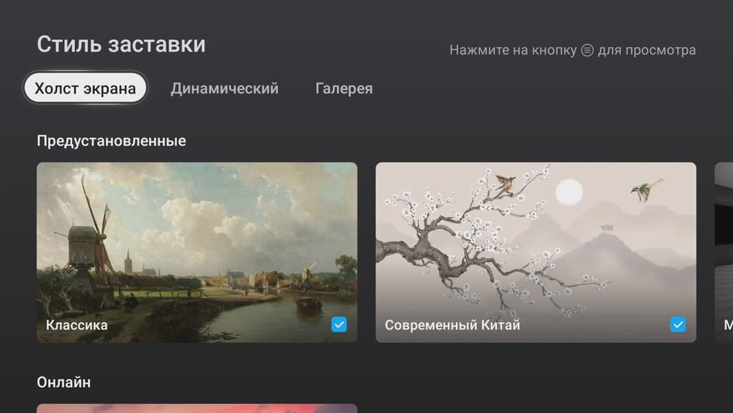 Есть функция Заставка — автоматический запуск вывода изображений на экран после настраиваемого периода отсутствия действий с телевизором. Изображения могут подгружаться из Сети, или из памяти телевизора, или могут использоваться картинки из папок на USB-носителе. Дополнительно есть три видеозаставки с динамичным изображением.