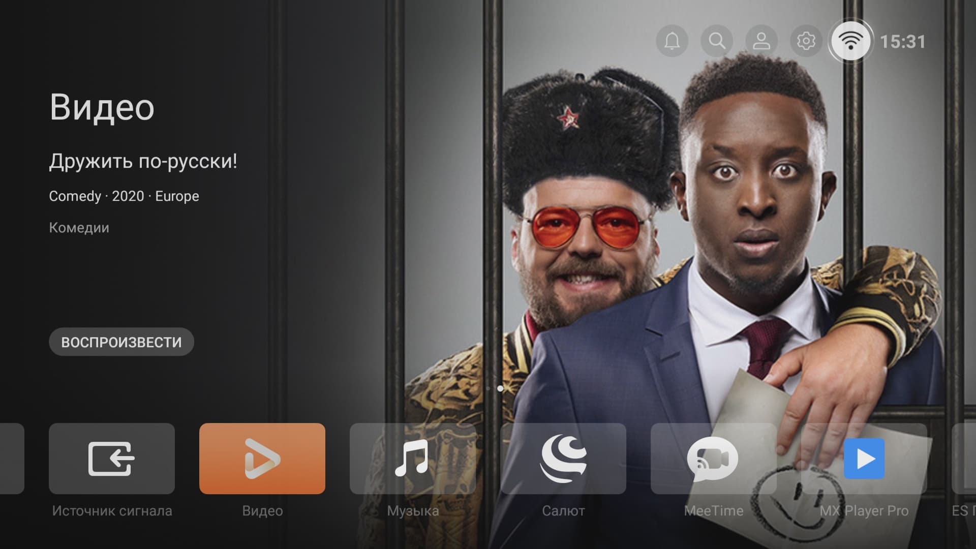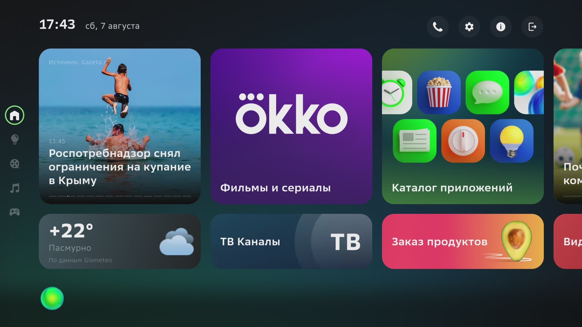 Домашняя страница Салют, которая выводится на экран после выбора одноименной плитки, имеет простой дизайн — горизонтальные ленты плиток приложений и сервисов занимают большую часть экрана справа, слева находится вертикальный столбец с закладками категорий, а вверху справа расположились четыре значка — вход в приложение для (видео)звонков, вывод меню с настройками ТВ, вывод информации для обращения в поддержку и выход из Салют.