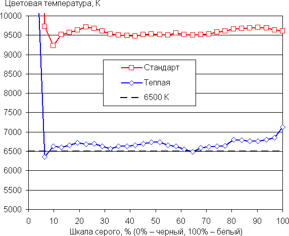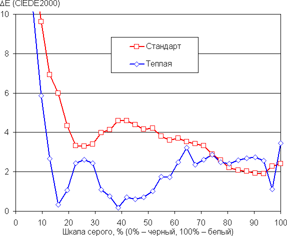 Графики ниже показывают цветовую температуру на различных участках шкалы серого и отклонение от спектра абсолютно черного тела (параметр ΔE) при выборе варианта Стандарт (самый яркий режим) для настройки Цветовая температура и варианта Теплая. К сожалению, возможность коррекции цветового баланса хотя бы настройками усиления трех основных цветов отсутствует.
