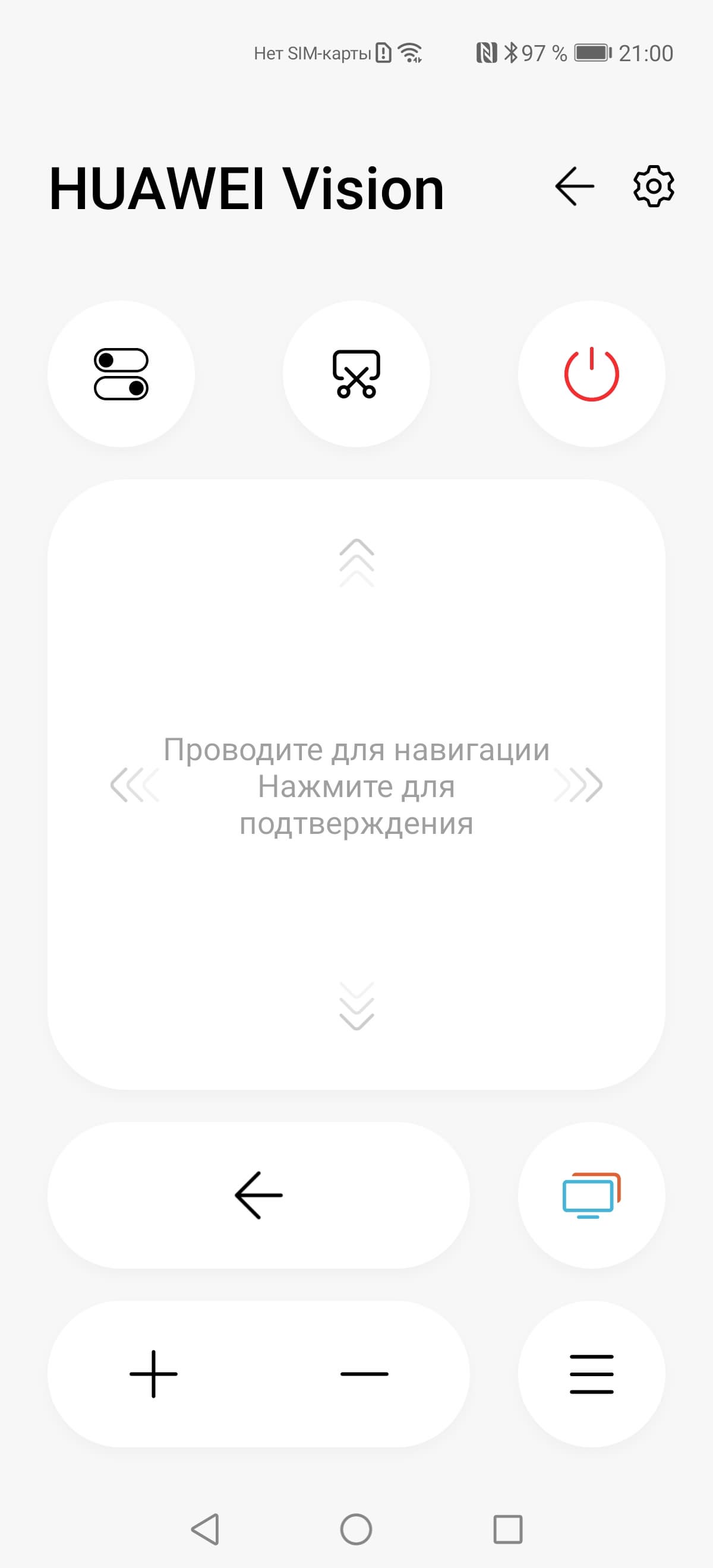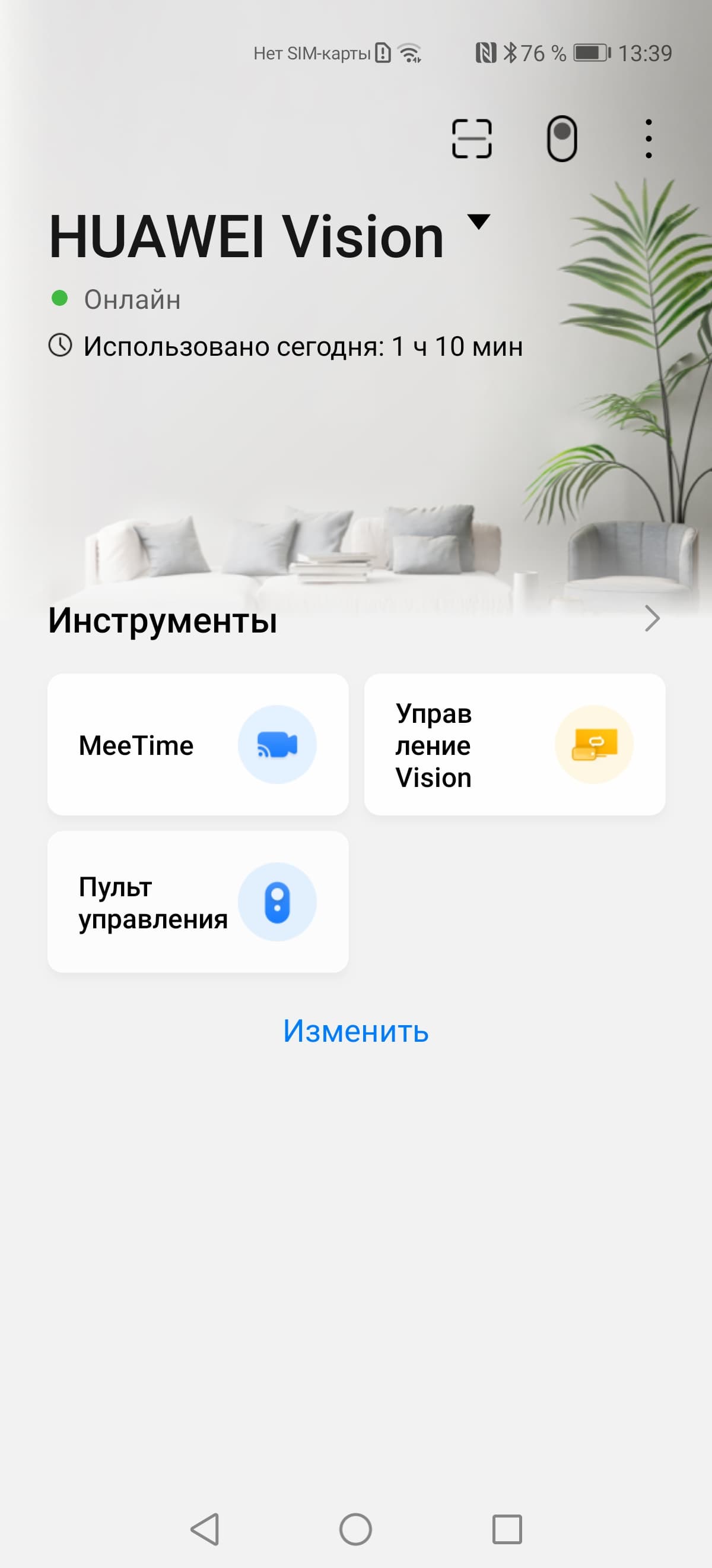 Напротив, приложение с названием Huawei Vision позволяет полноценно управлять телевизором и не только. С главной страницы приложения можно перейти к панели вызова MeeTime, чтобы совершить видеозвонок, при этом позвонить можно со смартфона на сам телевизор, даже если на них активна одна и та же учетная запись Huawei (в списке контактов устройства с одной и той же учетной записью отображаются как разные контакты). Если к учетной записи Huawei привязан телевизор Huawei Vision и мобильное устройство, то при входящем звонке MeeTime на планшет/смартфон появляется кнопка Ответ на телевизоре (устройства должны быть в одной сети), после нажатия на которую звонок переводится на телевизор. Во время разговора переводить звонок между устройствами уже нельзя.