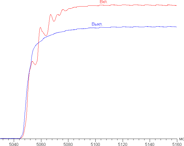 После включения функции динамической регулировки яркости подсветки максимальная яркость на светлом изображении увеличивается, а на темных изображениях яркость подсветки снижается. График ниже показывает, как меняется яркость (вертикальная ось) при переключении с черного поля (после 5 секунд выдержки) на белое при выключенной и включенной функции динамической регулировки яркости подсветки: