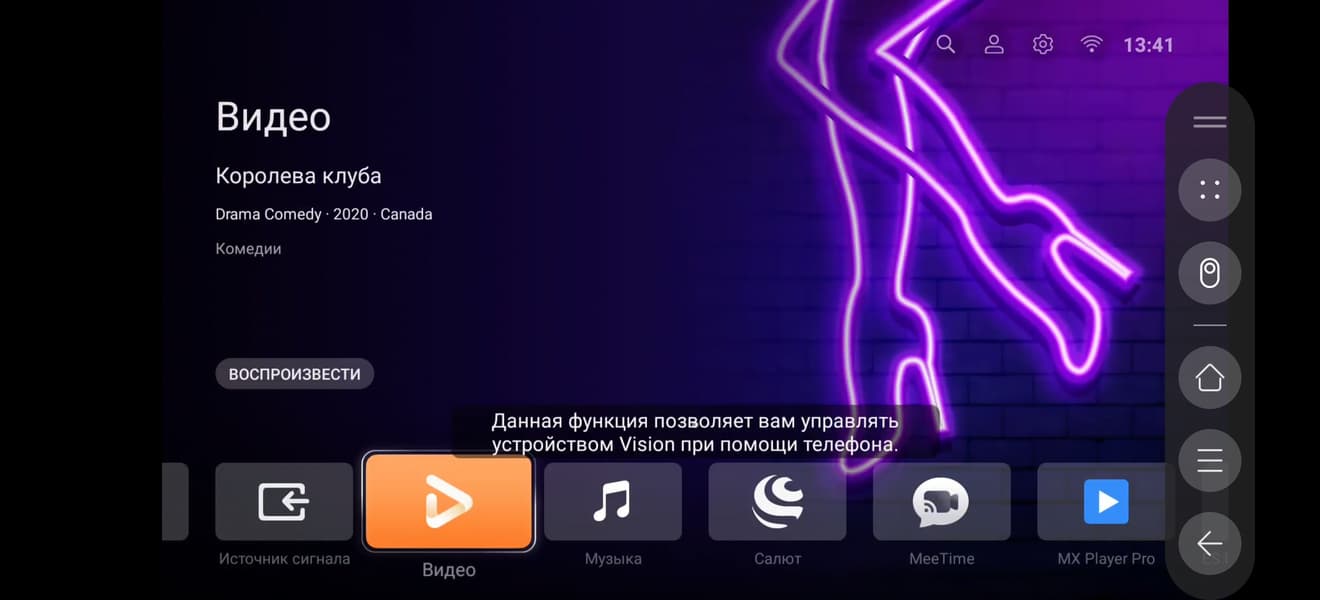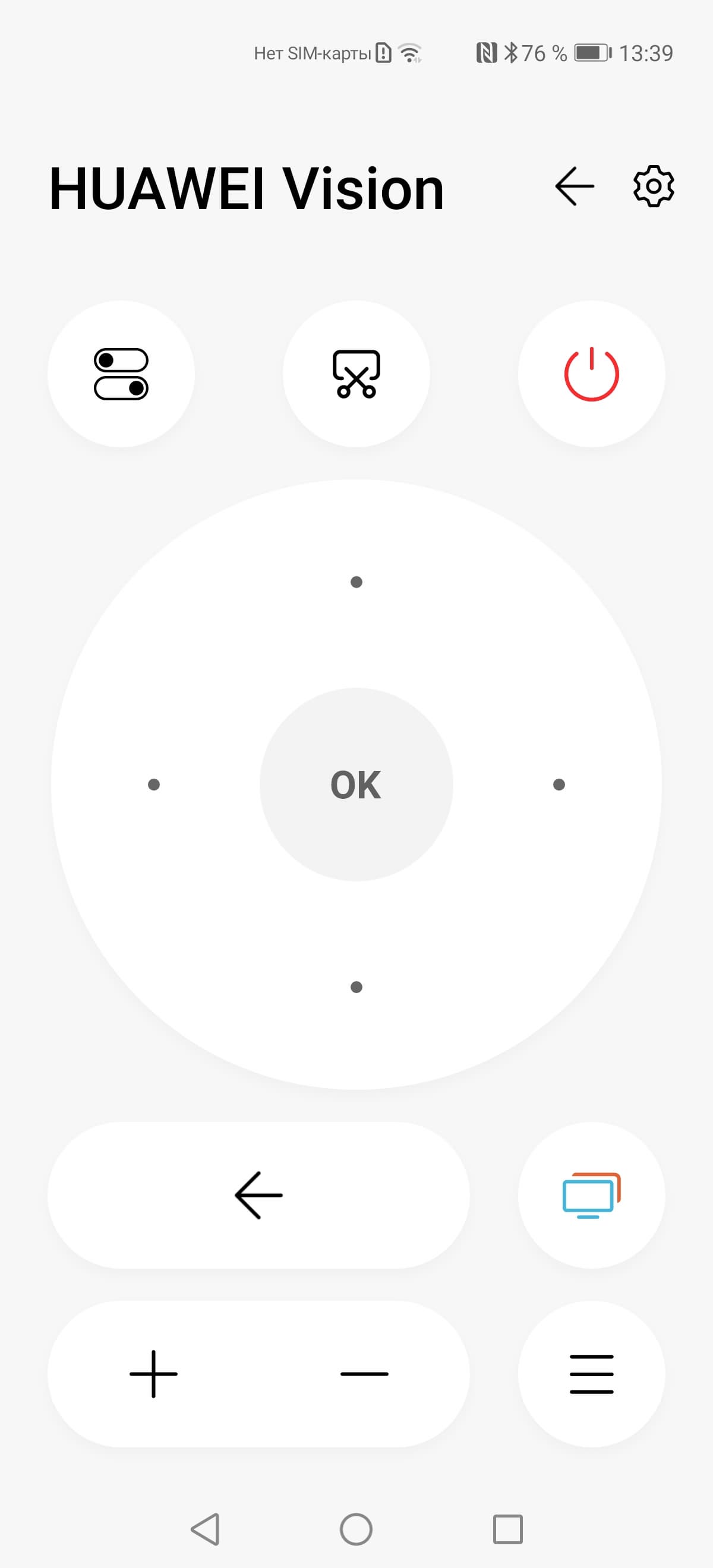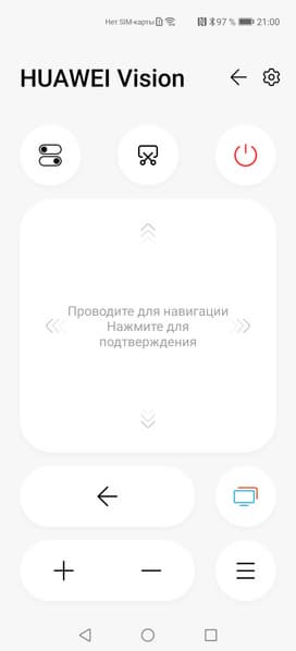 Касания и проводка пальцем по экрану смартфона передаются на ТВ в качестве аналогичных действий, также пользователю доступны виртуальные кнопки Домой, Меню и Отмена. При желании выводить звук можно не на телевизор, а на смартфон, также можно быстро переключиться на виртуальный пульт и вернуться обратно. Панель с описанными кнопками выводится справа и ее можно свернуть до небольшого кружочка с плюсом по центру.