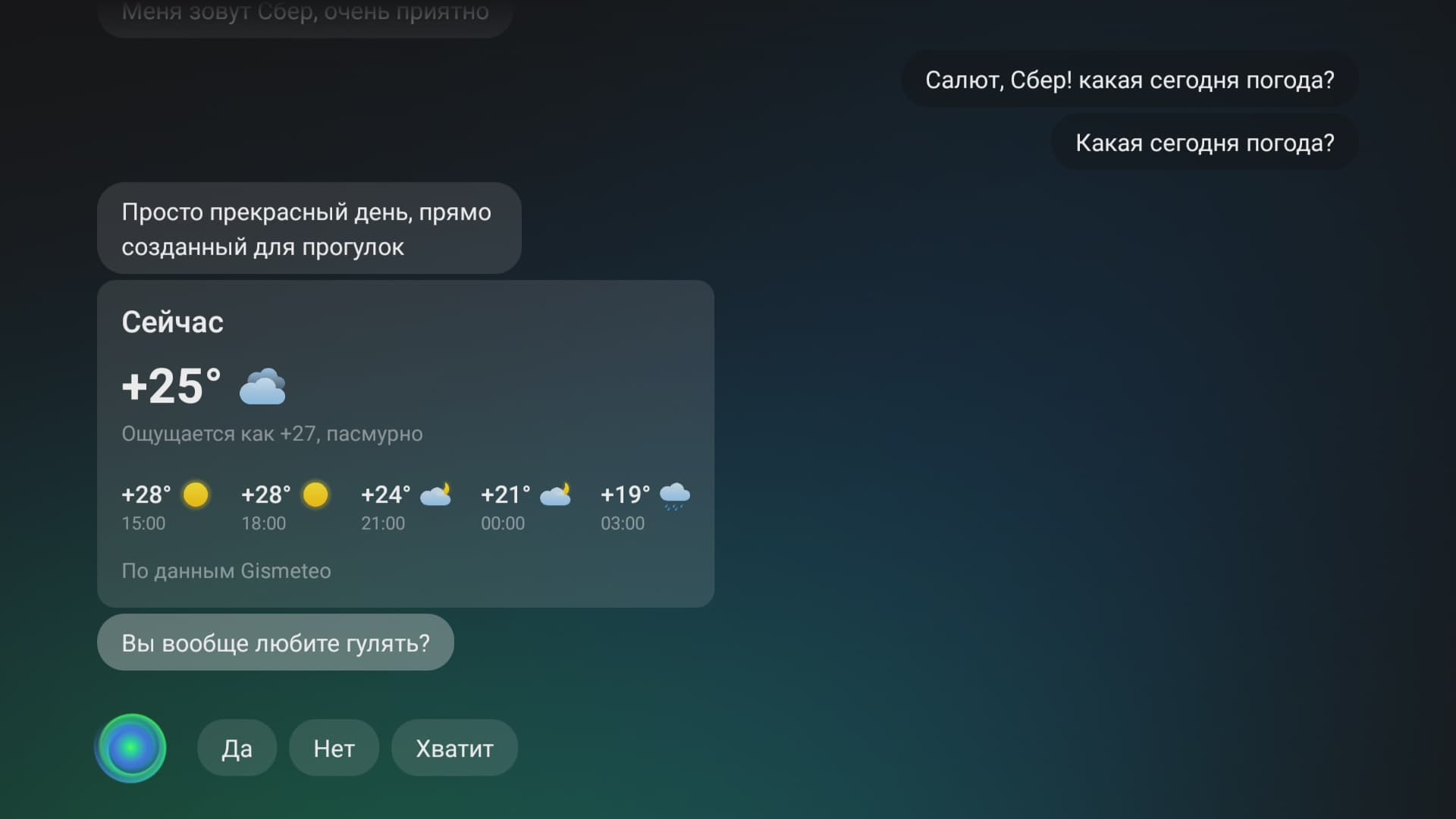 После включения с загрузкой системы телевизор слушает пользователя постоянно, что позволяет общаться с помощником без помощи пульта ДУ, достаточно вызывать помощника, произнеся слово «Салют». При этом используются микрофон на пульте и шесть микрофонов на самом ТВ одновременно. Но после включения из режима ожидания телевизор слушает пользователя уже только при удержании нажатой кнопки со значком микрофона. Звук самого телевизора во время общения с ассистентом приглушается. Общаться с голосовым помощником можно и тогда, когда оболочка Салют не активна, но источником информации для этого помощника служат только сервисы и приложения Салют. Также помощник почти ничего не умеет делать с самим ТВ — можно только уменьшить или увеличить громкость и выключить звук совсем, точнее снизить громкость до нуля. Ассистенты Салют умеют отвечать на некоторые вопросы, запускать приложения по названию (видимо, только из набора оболочки Салют), искать информацию и даже как-то поддерживать беседу.