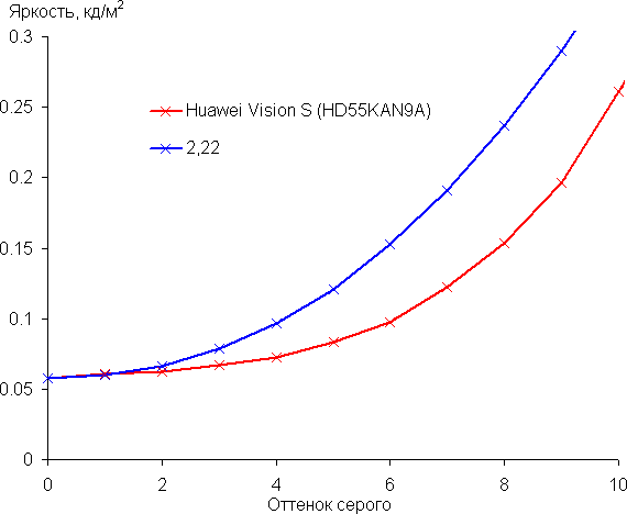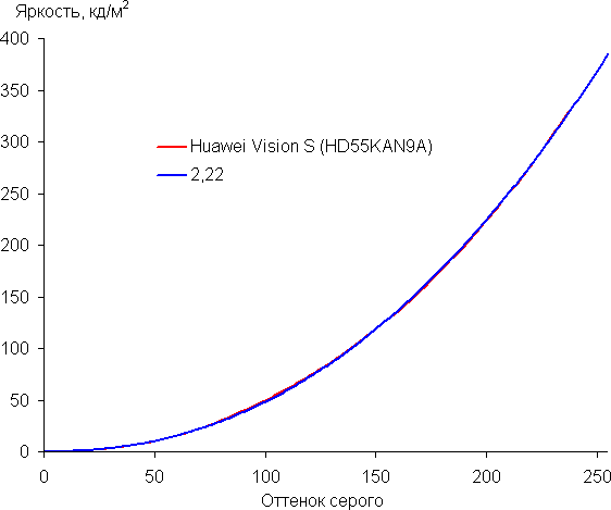 Аппроксимация полученной гамма-кривой дала показатель 2,22, что очень близко к стандартному значению 2,2, при этом реальная гамма-кривая мало отклоняется от аппроксимирующей степенной функции:
