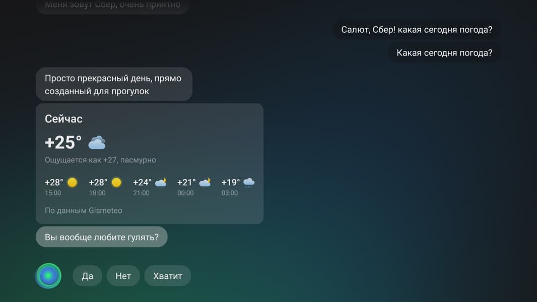 Например, на запрос «рецепт шарлотки» помощник находит видеокарточку соответствующего рецепта в приложении Супер Шеф. По команде «позвонить [имя контакта]» запускается видеозвонок в Telegram по этому контакту. Фраза «первый канал» — прямой эфир первого канала через Смотрешку. Если у ассистента возникают трудности с ответом на вопрос или выполнением того, что просит пользователь, то обычно выполняется поиск на YouTube по произнесенной фразе. Умений у помощника довольно много, но иногда он игнорирует запрос или реагирует на такой же запрос иначе.