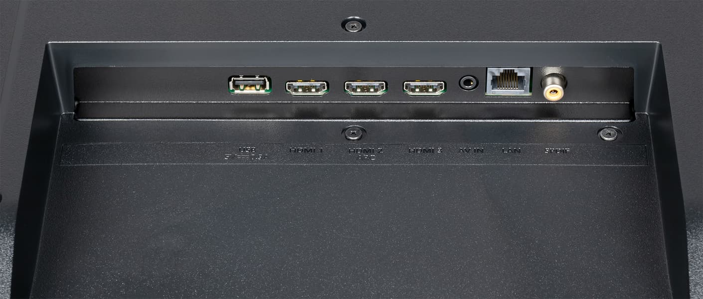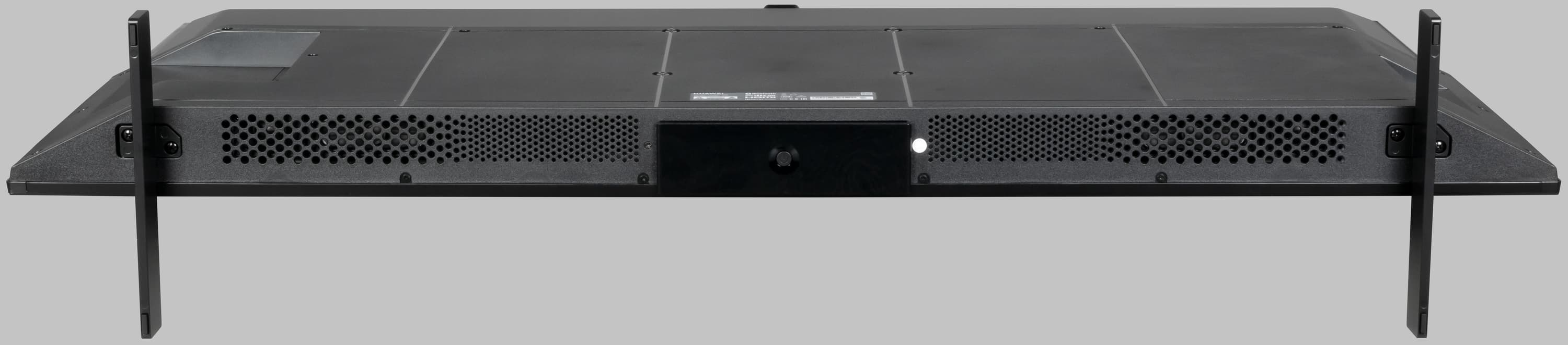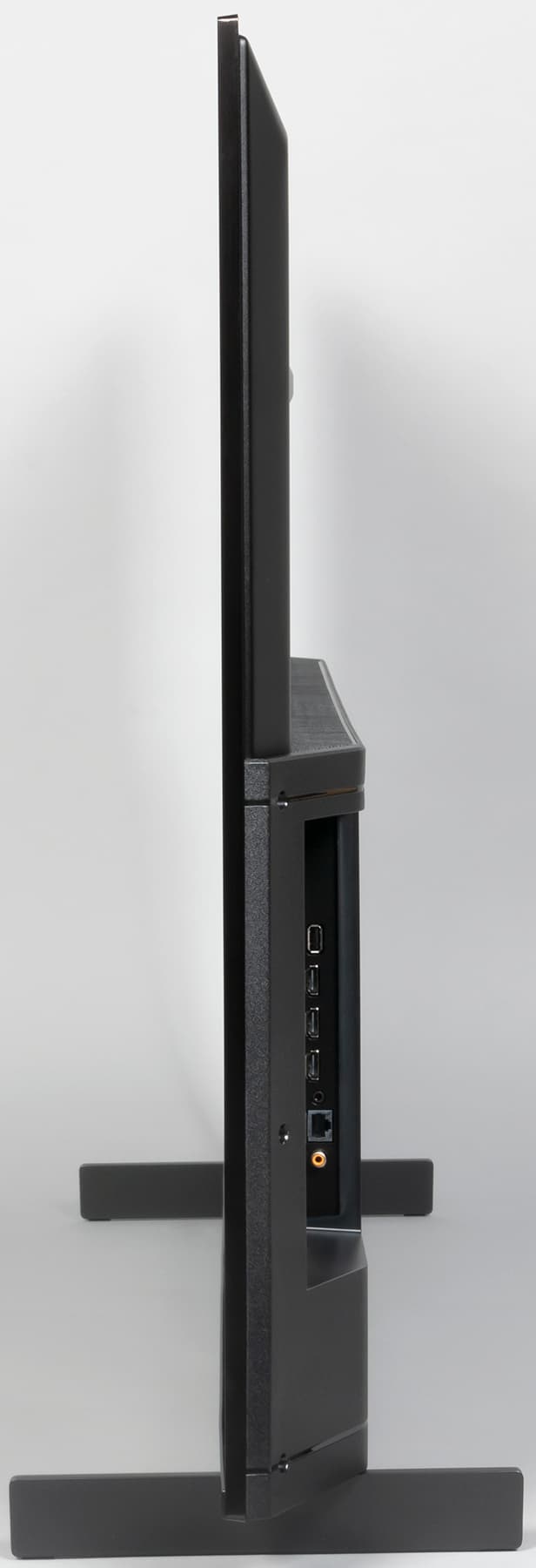 Интерфейсные разъемы размещены в незамкнутой нише на этом кожухе и направлены вбок. Спереди дотягиваться до разъемов неудобно, так как они находятся далеко от правого торца. Разъем питания также расположен в незамкнутой нише, но уже в противоположной стороне. В верхней части телевизор относительно тонкий.