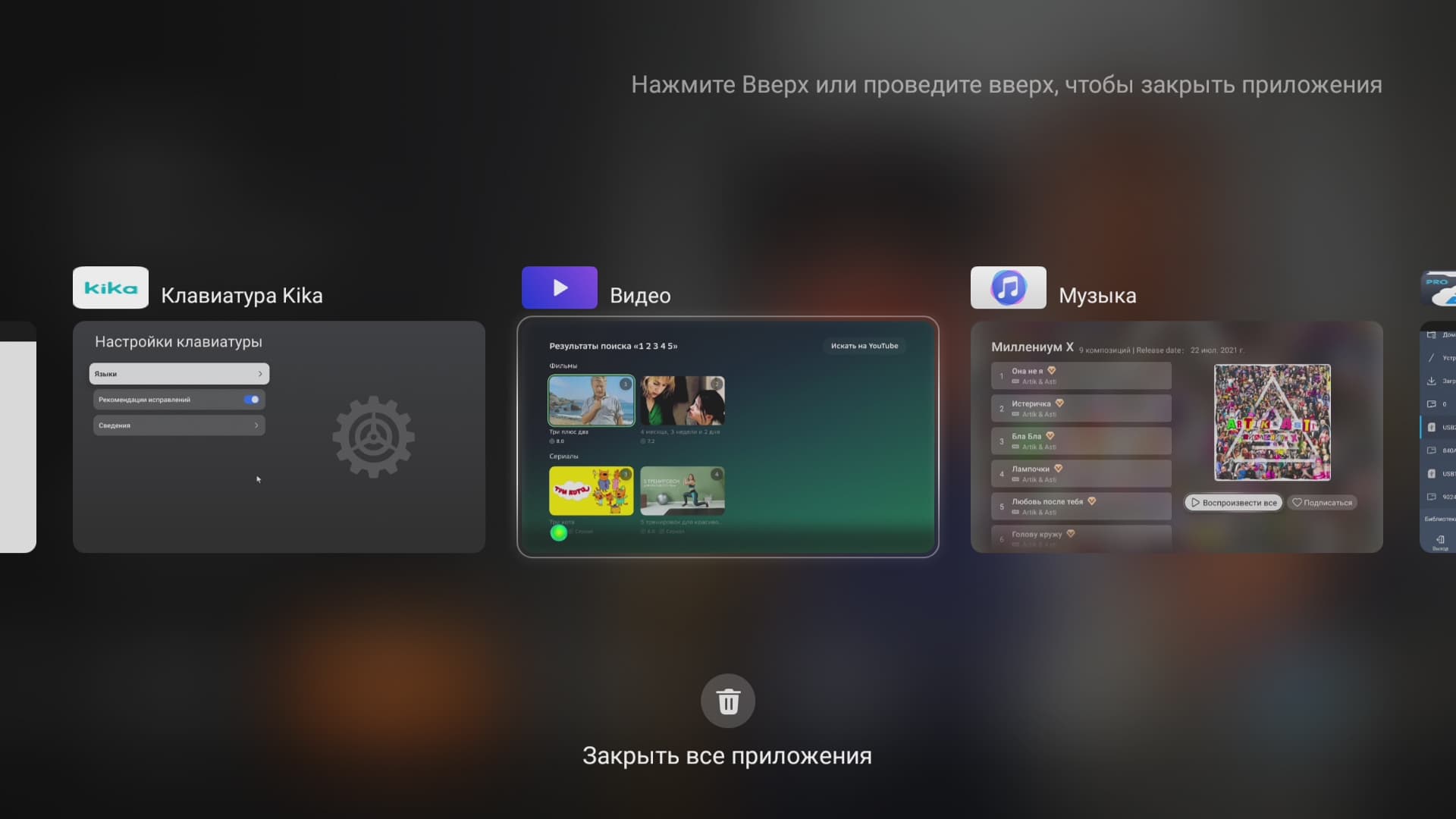 То, что выводится в качестве фона страницы зависит от выбранной плитки приложения на ленте и может меняться, например, рекламируя контент, доступный в данном приложении. Для удобства пользователя на фоне даже может быть активная кнопка Воспроизвести или, например, кнопки выбора накопителя в случае выбора плитки встроенного плеера. Первые шесть плиток (вплоть до плитки MeeTime включительно) зафиксированы на своих местах, остальные плитки пользователь может перемещать и удалять, также на ленту можно добавлять плитки других установленных приложений.