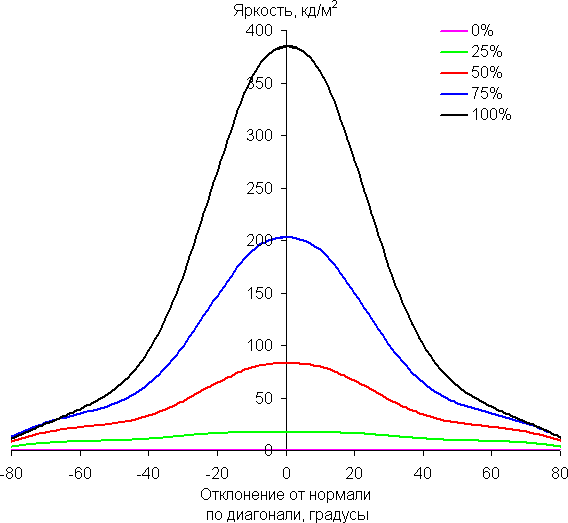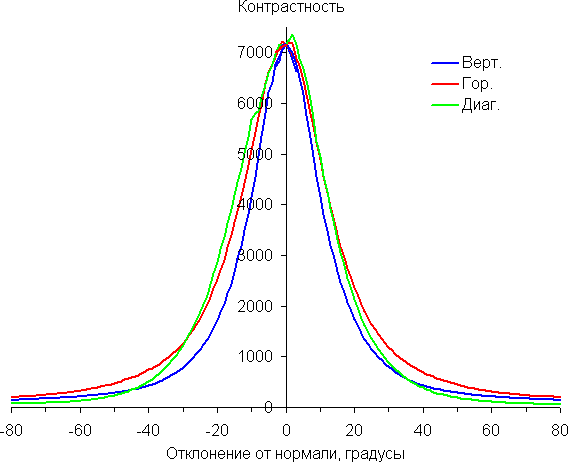 По скорости снижения яркости углы обзора неширокие. Яркость черного поля при отклонении от перпендикуляра к экрану возрастает, но всего до примерно 0,1% от максимальной яркости белого поля и только при большом отклонении. Это отличный результат. Контрастность в диапазоне углов ±82° для всех направлений значительно превышает 10:1.