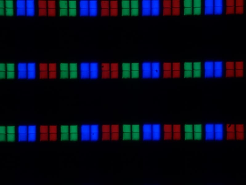 Выявленные характеристики экрана позволяют предположить, что в данном телевизоре установлена матрица типа *VA. Микрофотографии не противоречат этому (черные точки — это пыль на матрице фотоаппарата).