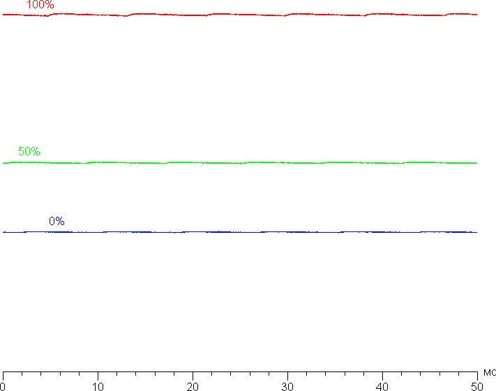 На любом уровне яркости значимая модуляция подсветки отсутствует (нет ШИМ), поэтому нет и никакого мерцания экрана. В доказательство приведем графики зависимости яркости (вертикальная ось) от времени (горизонтальная ось) при различных значениях настройки Уровень подсветки: